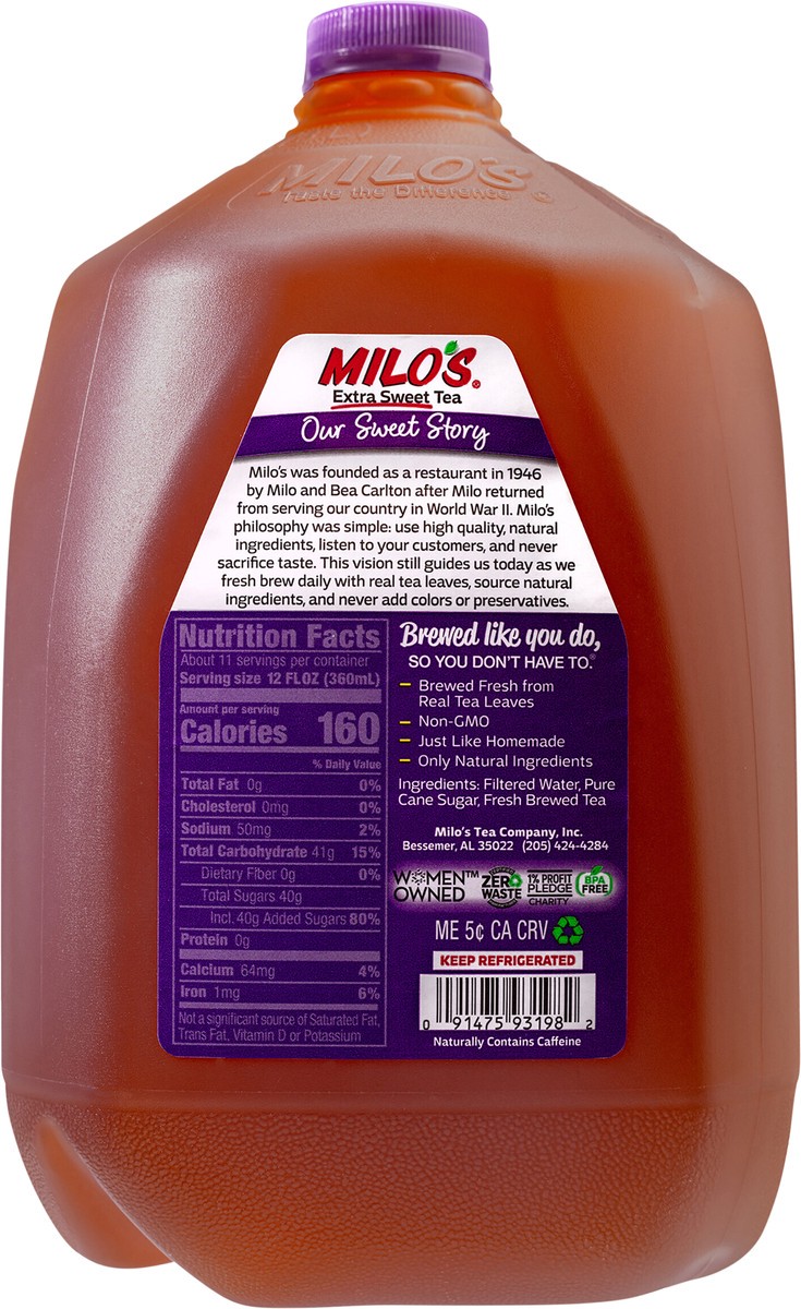 Naturally contains caffeine. Non-GMO. 100% natural. Family-made since 1946. Brewed fresh. 3 simple ingredients. New cap! Taste the difference. No foil seal. Our Sweet Story: Milo's was founded as a re…