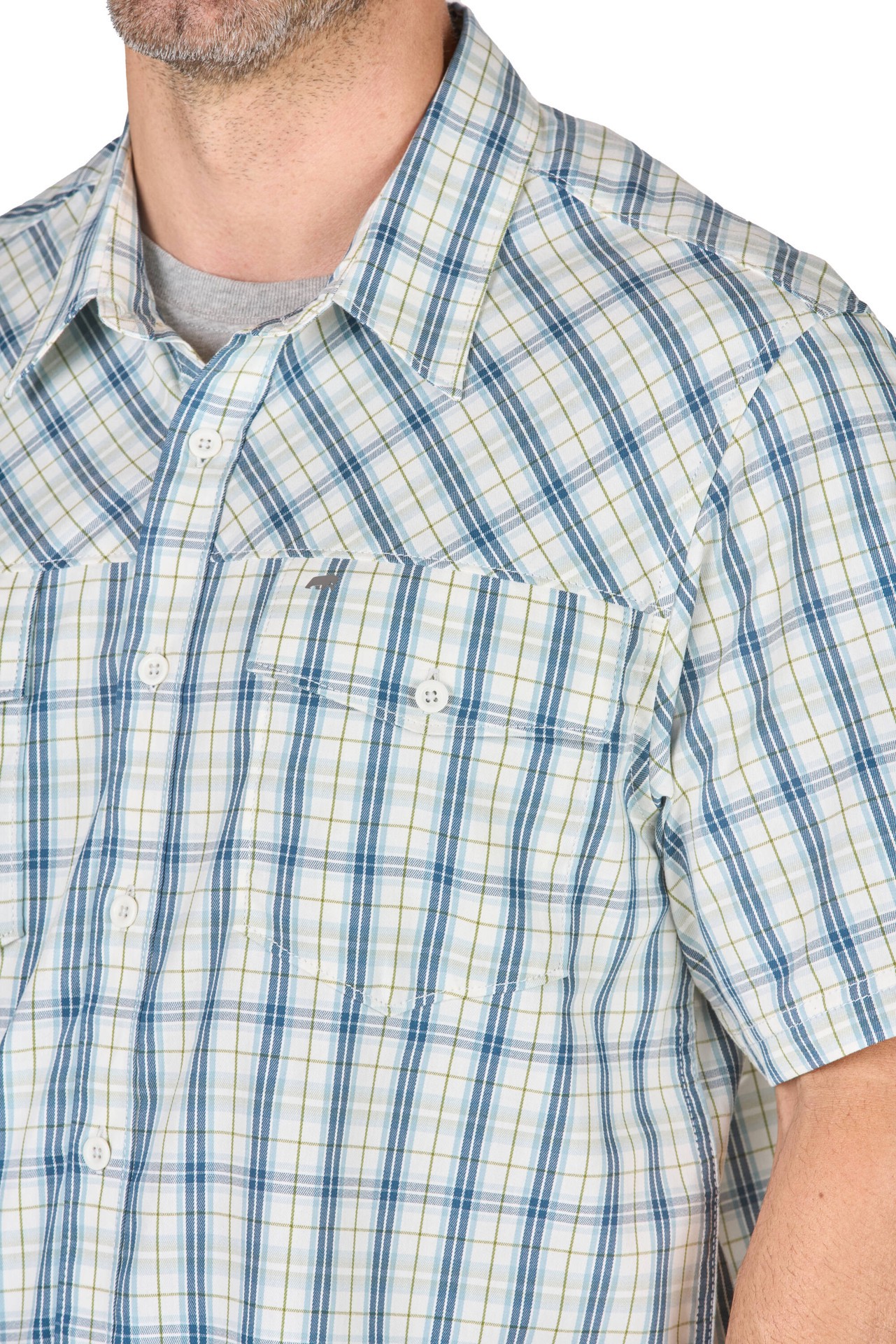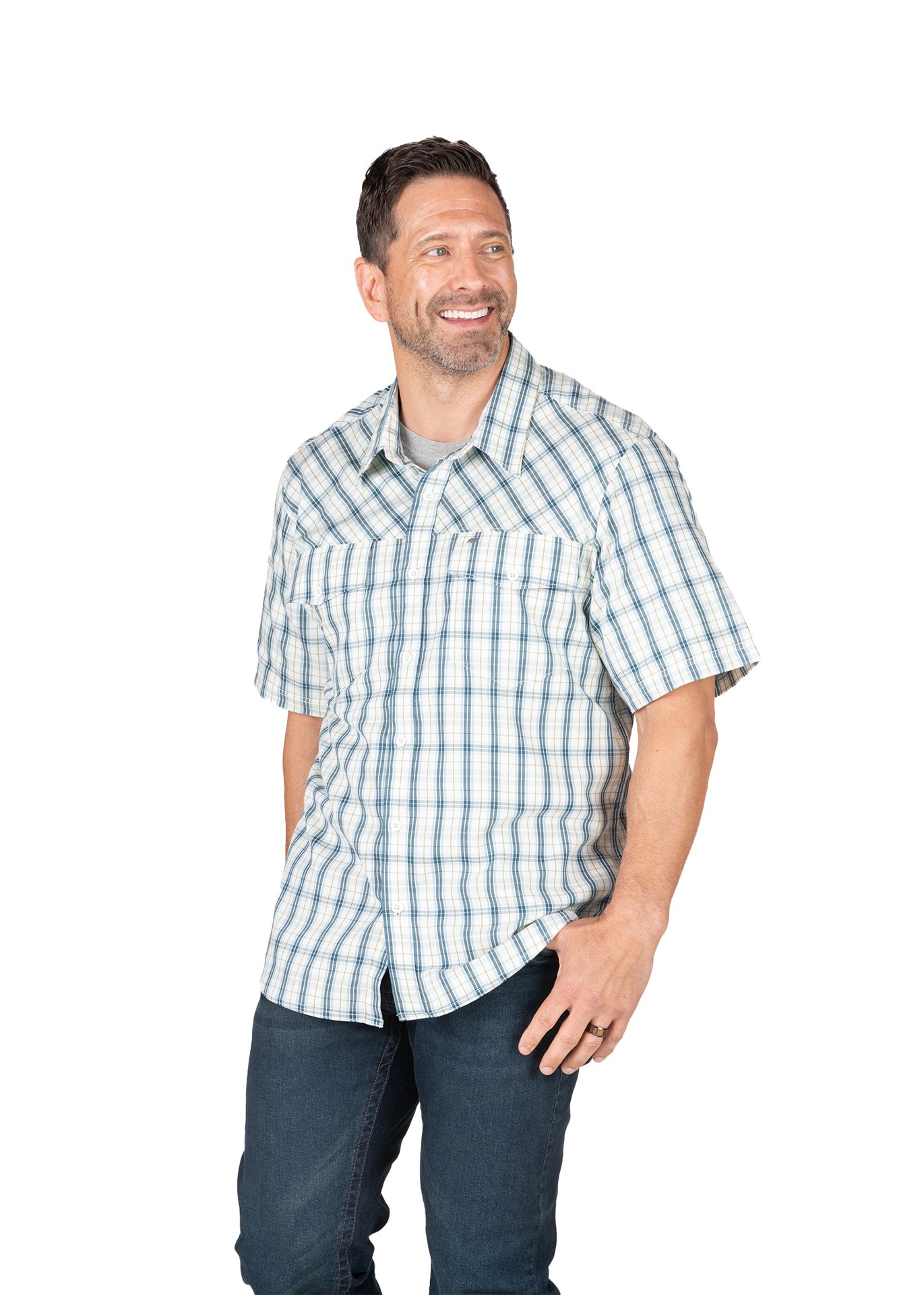 Flex180® provides 2-way stretch for optimal mobility. UPF 30 plus sun protection. Button front closure with 2 buttoned chest pockets with pen slot easily carry everyday items.