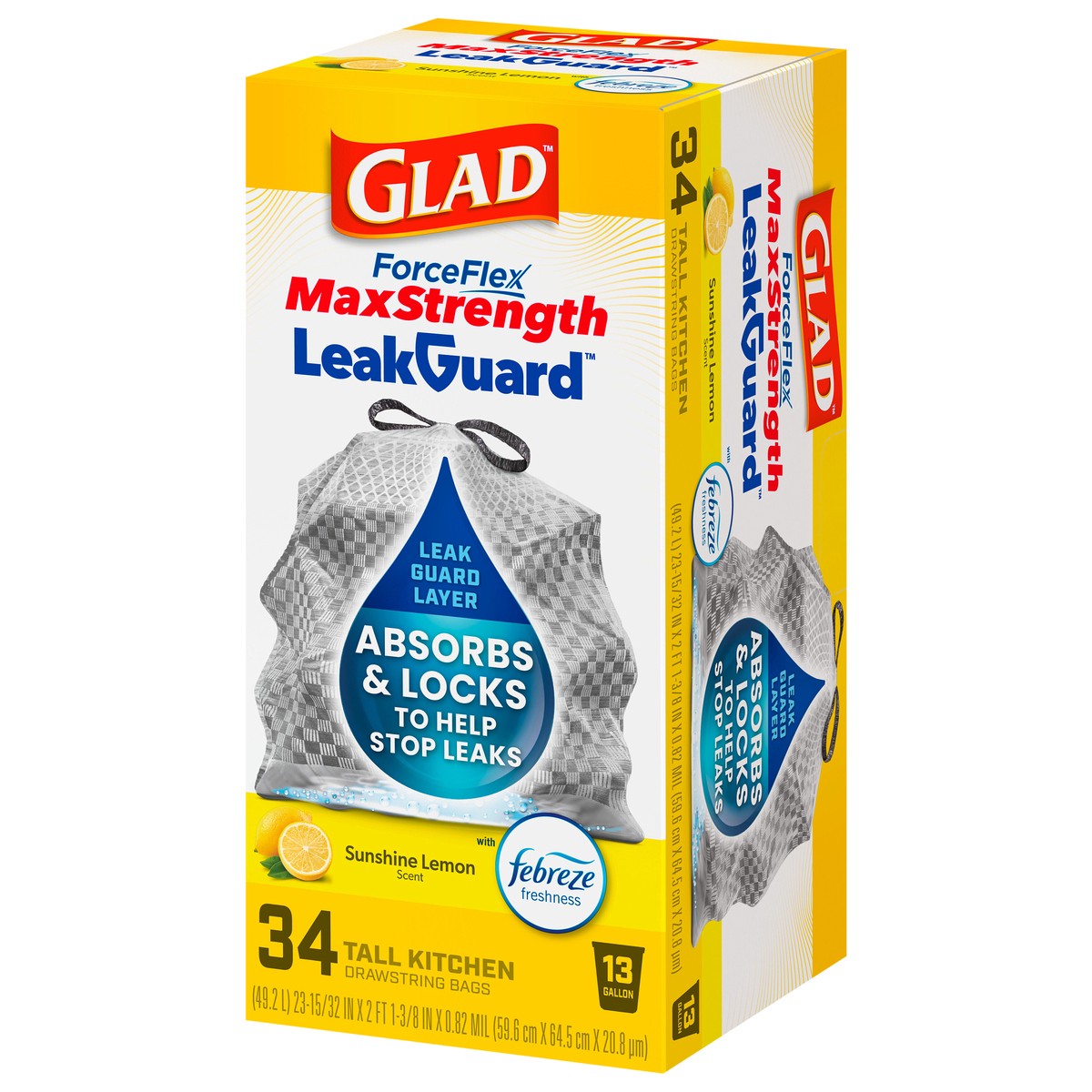 Glad ForceFlex MaxStrength LeakGuard Tall Kitchen Drawstring Trash Bags, 13 Gallon, Sunshine Lemon Scent with Febreze Freshness, 34 Count