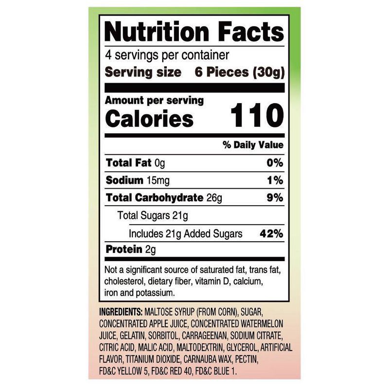 MALTOSE SYRUP (FROM CORN), SUGAR, CONCENTRATED APPLE JUICE, CONCENTRATED WATERMELON JUICE, GELATIN, SORBITOL, CARRAGEENAN, SODIUM CITRATE, CITRIC ACID, MALIC ACID, MALTODEXTRIN, GLYCEROL, ARTIFICIAL F…