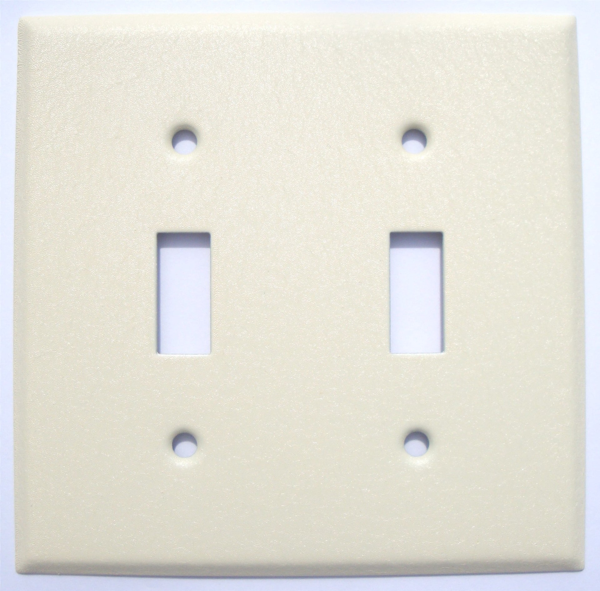 Covers 2 toggle switches. This line is available in a wide range of openings. High quality steel with a durable powder coating. Elegant wrinkle ivory finish. Standard shape with bevel edge. Can be paiā¦