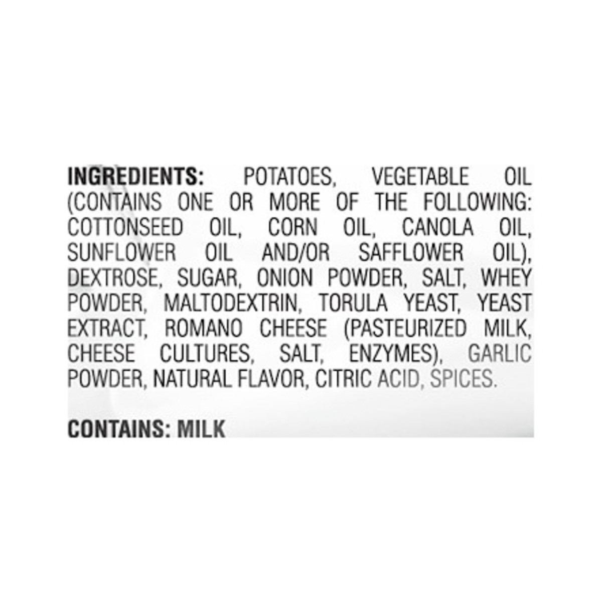 Potatoes, Vegetable Oil (Contains One or More of the Following: Cottonseed Oil, Corn Oil, Canola Oil, Sunflower Oil and/or Safflower Oil), Dextrose, Sugar, Onion Powder, Salt, Whey Powder, Maltodextri…