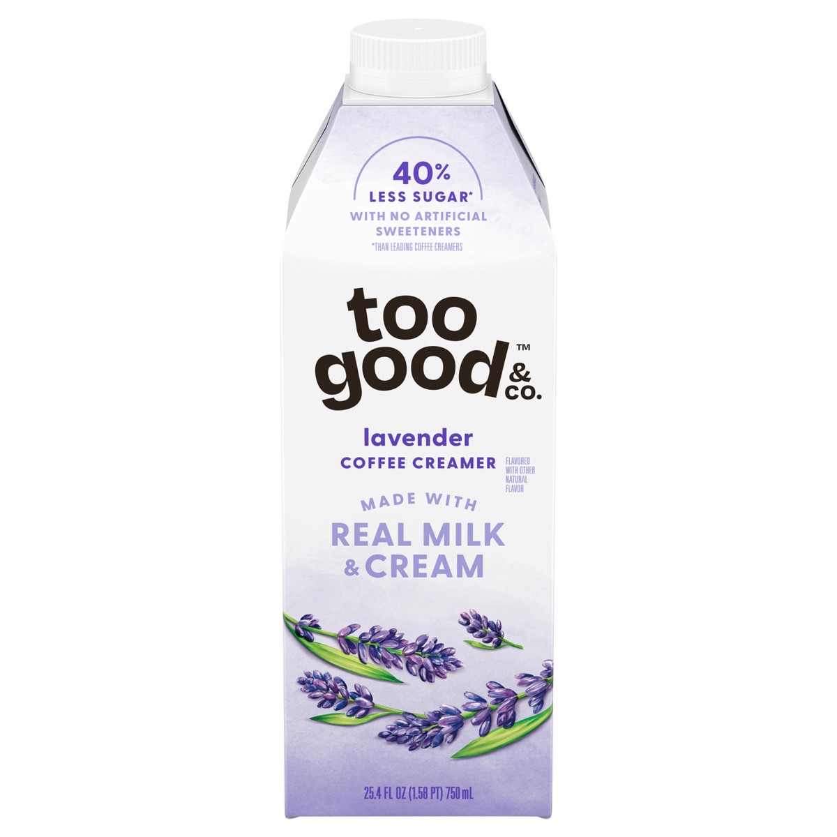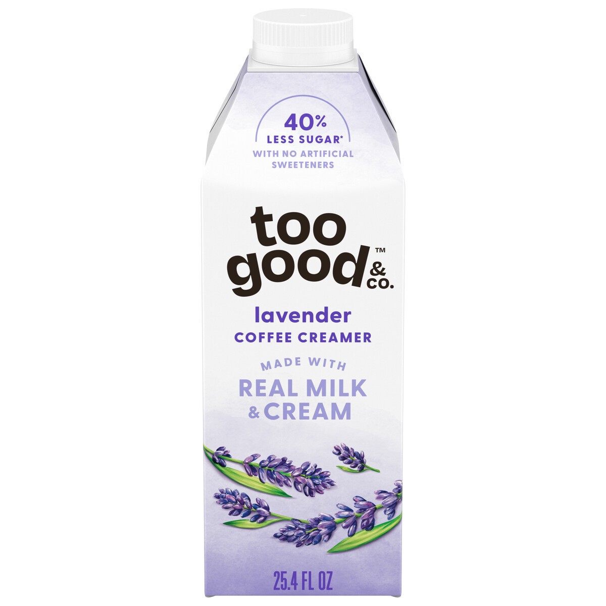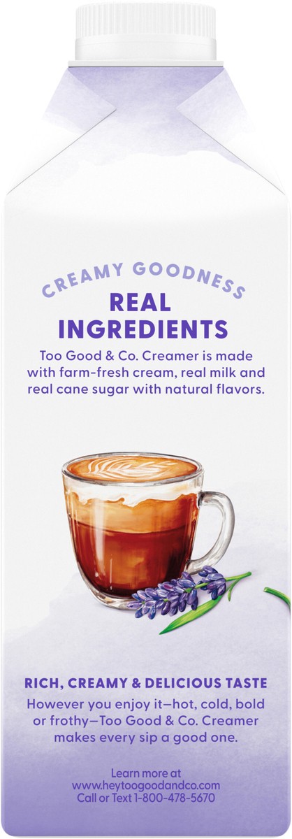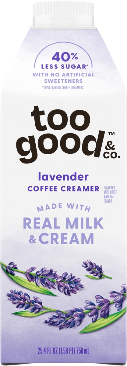 - Deliciously Good Coffee Creamer: One 25.4 fl oz bottle of Too Good & Co. Lavender Coffee CreamerReal Goodness: Too Good & Co. Lavender Creamer is made with real milk, real cream and real cane sugar40% Less Sugar*: Too Good & Co. Lavender Coffee Creamer contains 3g sugar per serving, 40% less than leading coffee creamers*Enhance Hot and Cold Coffee: Add this flavored creamer to your favorite coffee beverages, including iced coffee, cold brew, lattes and it also tastes great in morning shakes and breakfast smoothiesGoodness You Can Trust: Lavender creamer contains no artificial sweeteners, artificial flavors, preservatives, added gums or added oils