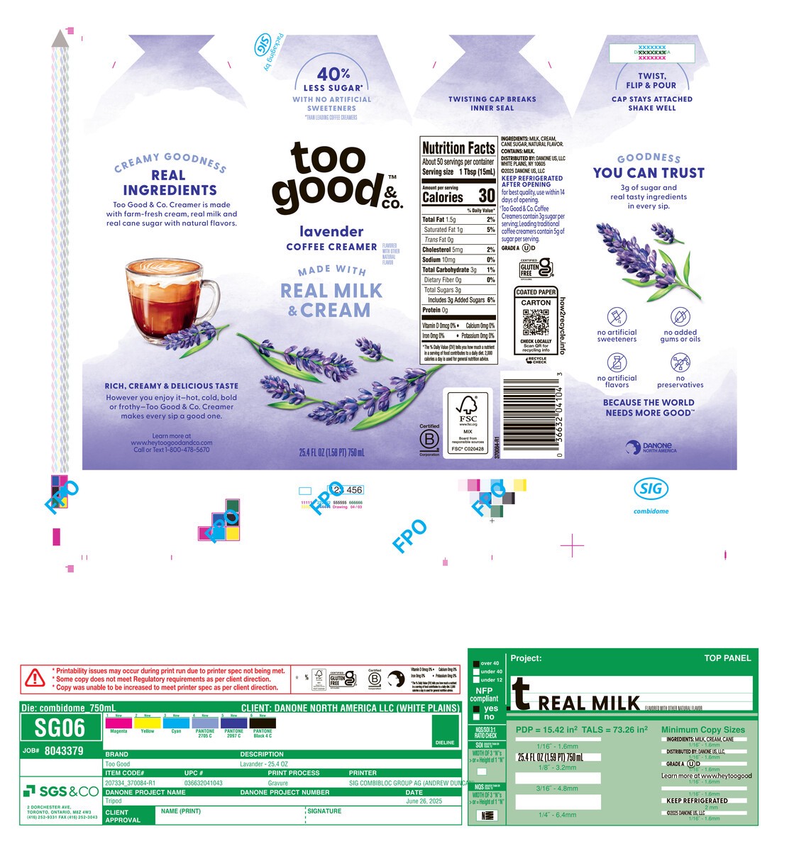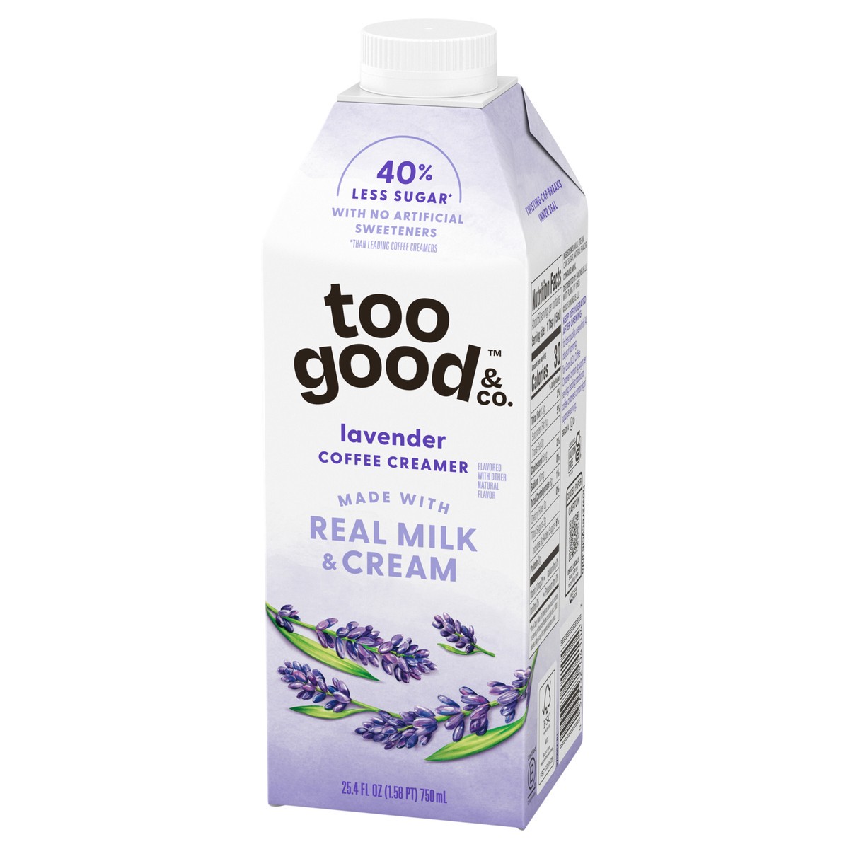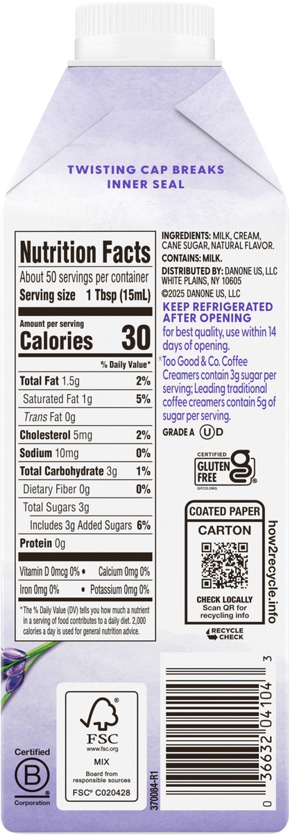 - Deliciously Good Coffee Creamer: One 25.4 fl oz bottle of Too Good & Co. Lavender Coffee CreamerReal Goodness: Too Good & Co. Lavender Creamer is made with real milk, real cream and real cane sugar40% Less Sugar*: Too Good & Co. Lavender Coffee Creamer contains 3g sugar per serving, 40% less than leading coffee creamers*Enhance Hot and Cold Coffee: Add this flavored creamer to your favorite coffee beverages, including iced coffee, cold brew, lattes and it also tastes great in morning shakes and breakfast smoothiesGoodness You Can Trust: Lavender creamer contains no artificial sweeteners, artificial flavors, preservatives, added gums or added oils