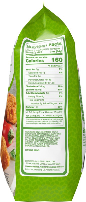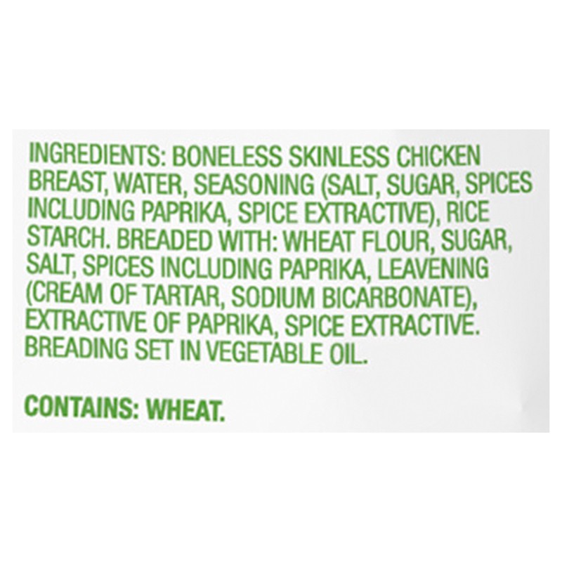 Boneless Skinless Chicken Breast with Meat Water. Contains less than 2% of Salt Sugar. Breaded and Glazed with: Bourbon Glaze (Water Molasses High Fructose Corn Syrup Rice Wine Vinegar Pineapple Conce…