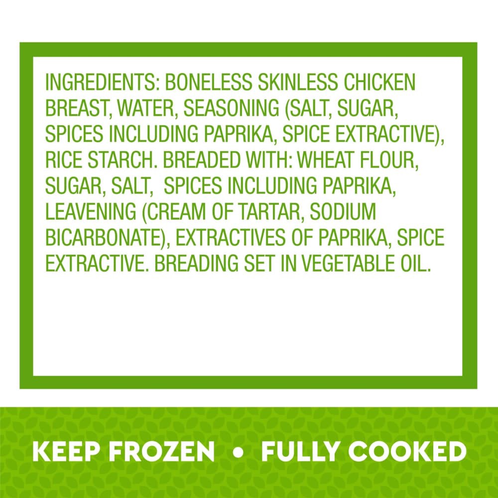 Boneless Skinless Chicken Breast with Meat Water. Contains less than 2% of Salt Sugar. Breaded and Glazed with: Bourbon Glaze (Water Molasses High Fructose Corn Syrup Rice Wine Vinegar Pineapple Conce…