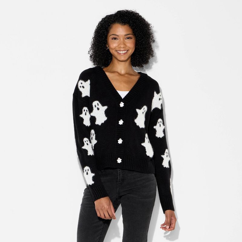 Stack your wardrobe with a cozy piece using the Women's Ghost Graphic Cardigan in Black. This knit cardigan features a cute ghost graphic that brings just the right amount of Halloween spirit to your …