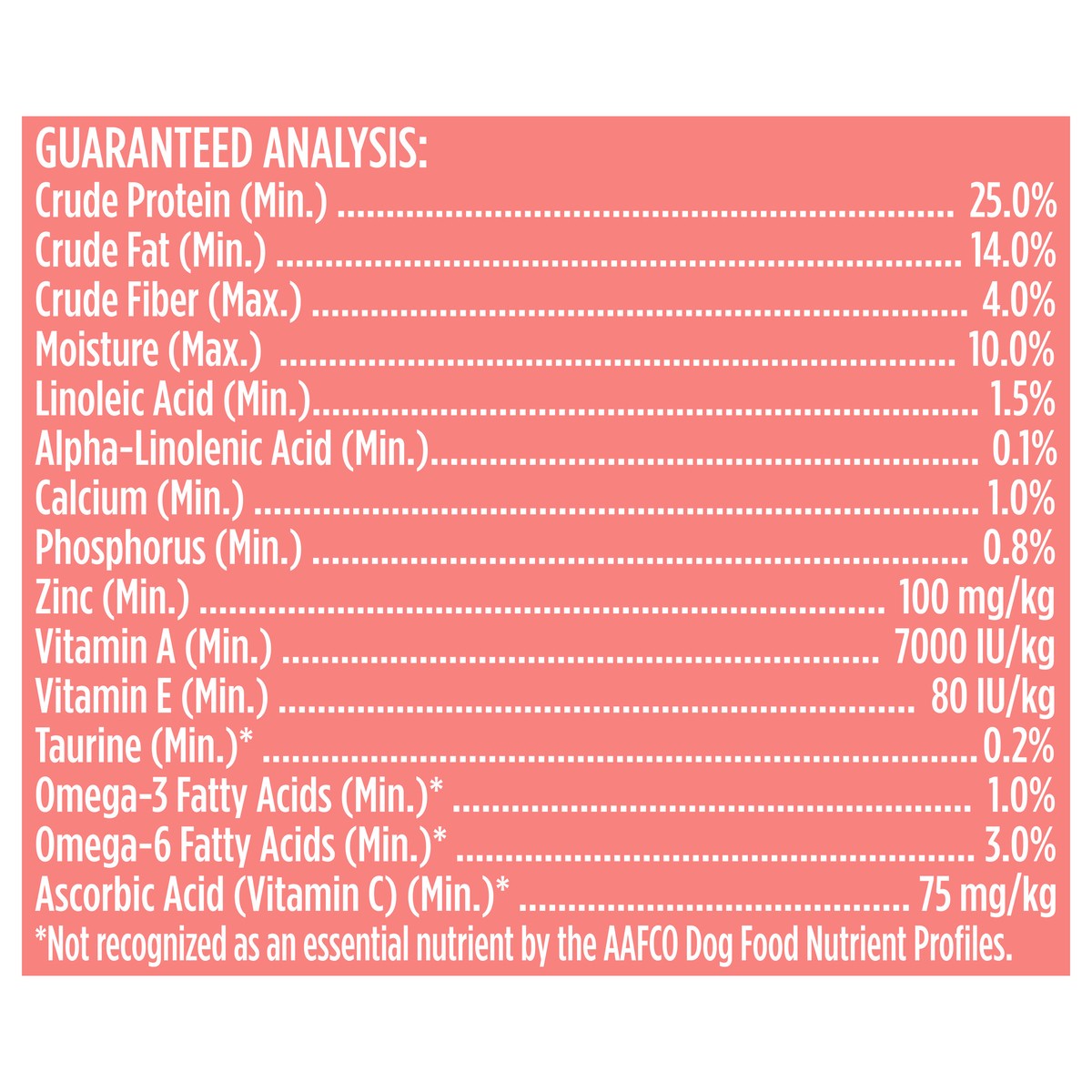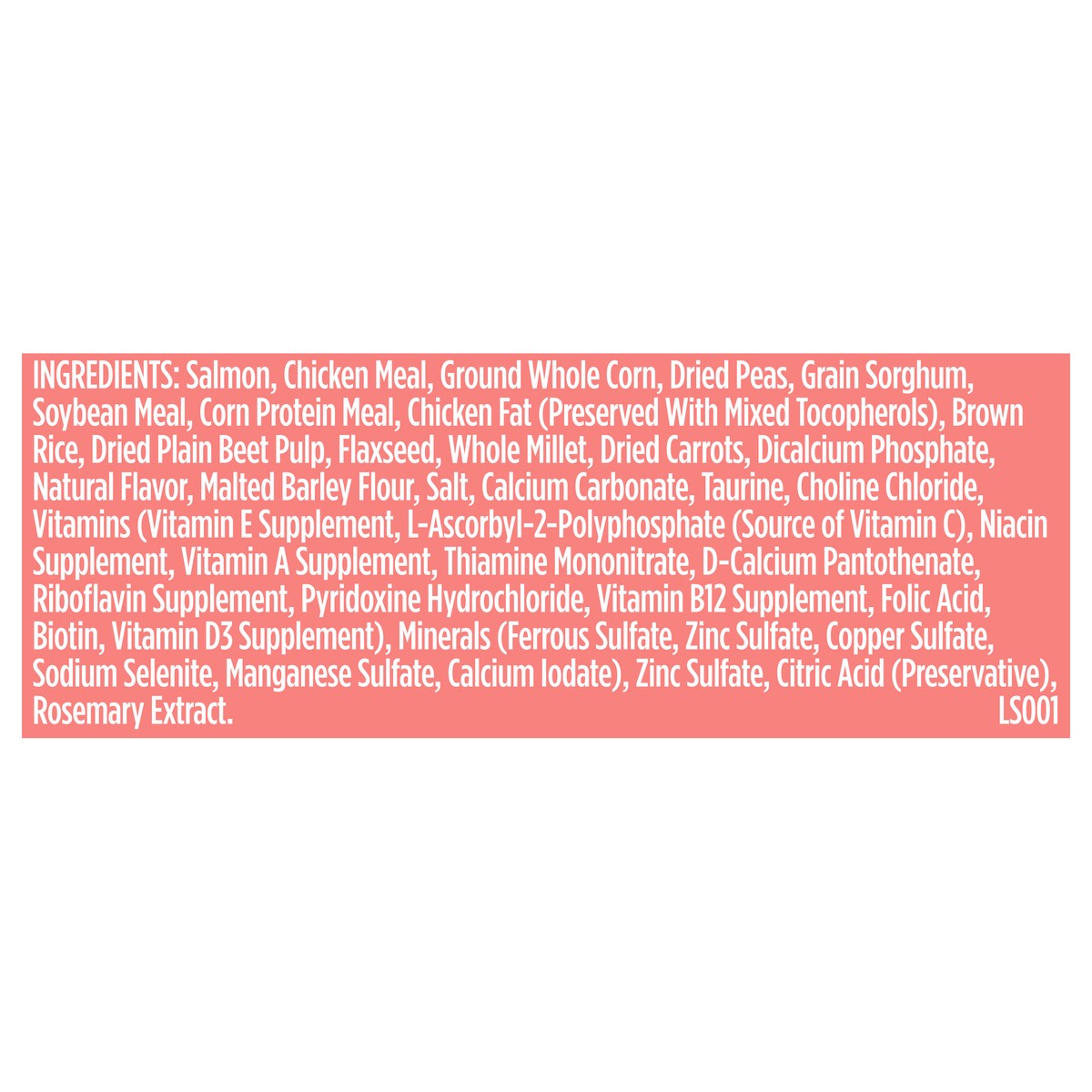 Salmon, Chicken Meal, Ground Whole Cor, Dried Peas, Grain Sorghum, Soybean Meal, Corn Protein Meal, Chicken Fat (Preserved with Mixed Tocopherols), Brown Rice, Dried Plain Beet Pulp, Flaxseed, Whole M…
