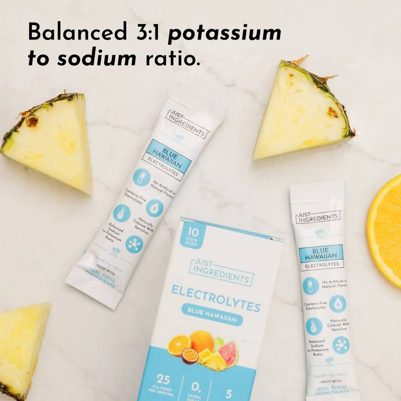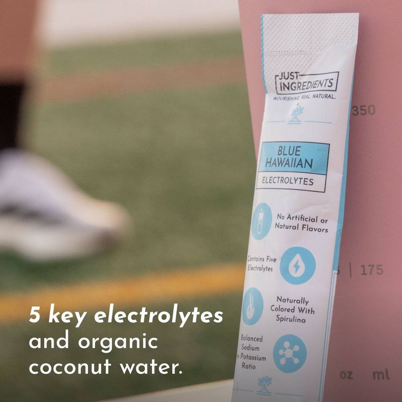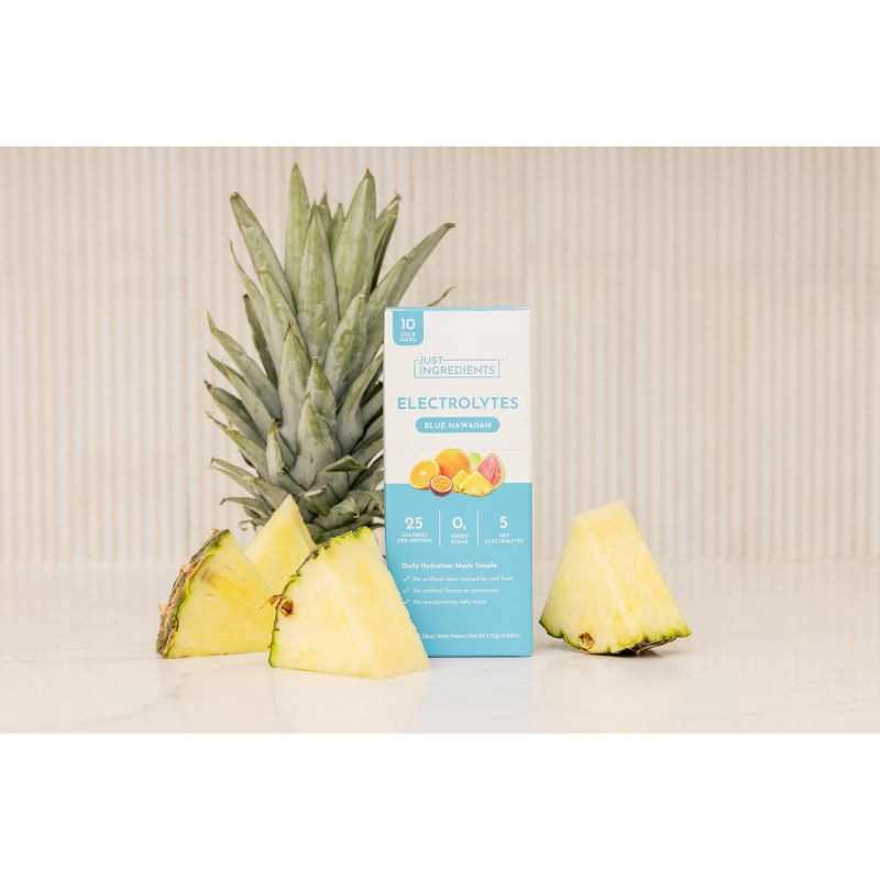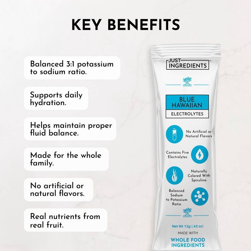 Support everyday hydration and balance with Just Ingredients Blue Hawaiian Electrolytes. Flavored and colored with only real food, no natural flavors, no artificial sweeteners or flavors, no added sug…