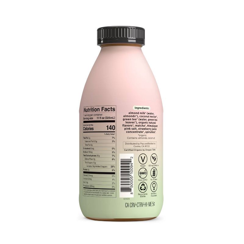 Almond Milk* (Water, Almonds*), Coconut Nectar*, Green Tea* (Water, Green Tea Leaves*), Organic Natural Flavors*, Matcha*, Himalayan Pink Salt, Strawberry Juice Concentrate*, Spirulina*. * Organic.
