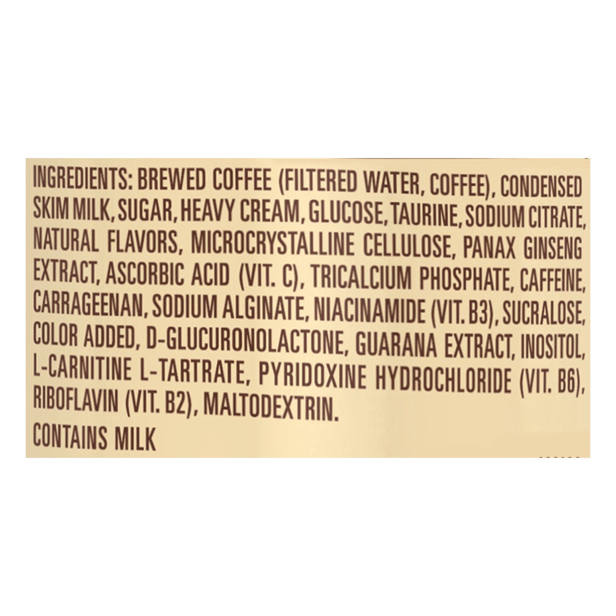 Brewed Coffee (Filtered Water, Coffee), Skim Milk, Sugar, Cream, Glucose, Taurine, Natural Flavors, Sodium Citrate, Microcrystalline Cellulose, Panax Ginseng Flavor, Tricalcium Phosphate, Ascorbic Aci…