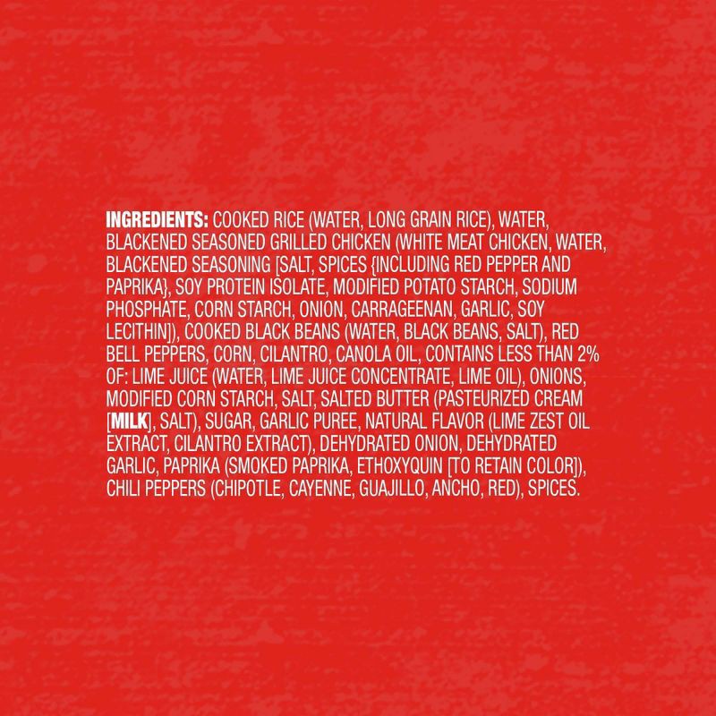COOKED RICE (WATER, LONG GRAIN RICE), WATER, BLACKENED SEASONED GRILLED CHICKEN (WHITE MEAT CHICKEN, WATER, BLACKENED SEASONING [SALT, SPICES (INCLUDING RED PEPPER AND PAPRIKA), SOY PROTEIN ISOLATE, M…