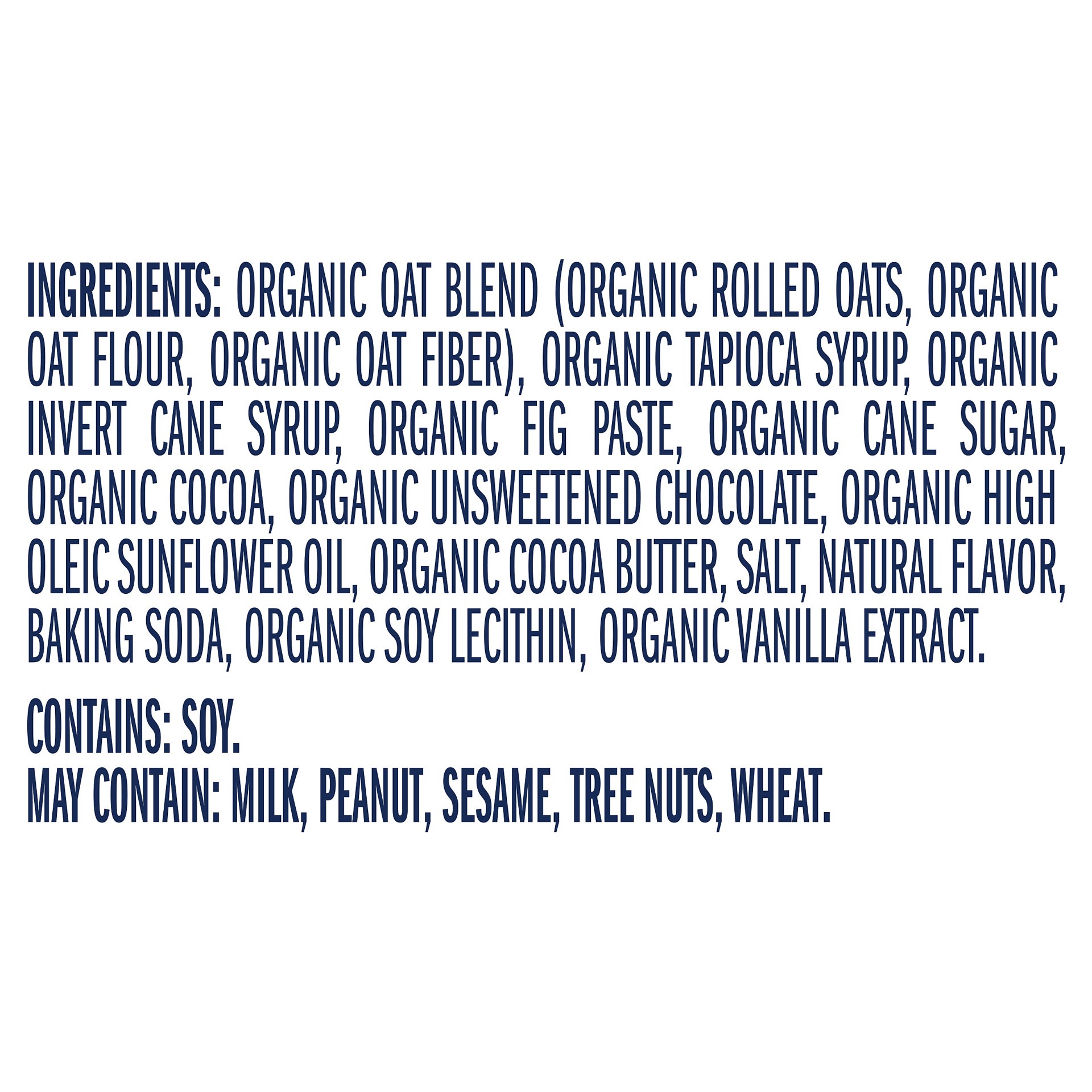 Organic Oat Blend (Organic Rolled Oats, Organic Oat Flour, Organic Oat Fiber), Organic Tapioca Syrup, Organic Invert Cane Syrup, Organic Fig Paste, Organic Cane Sugar, Organic Cocoa, Organic Unsweeten…