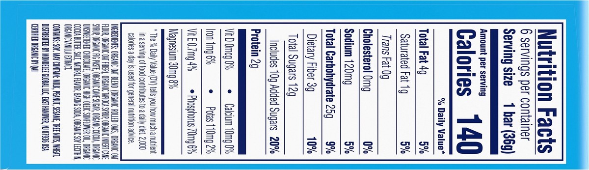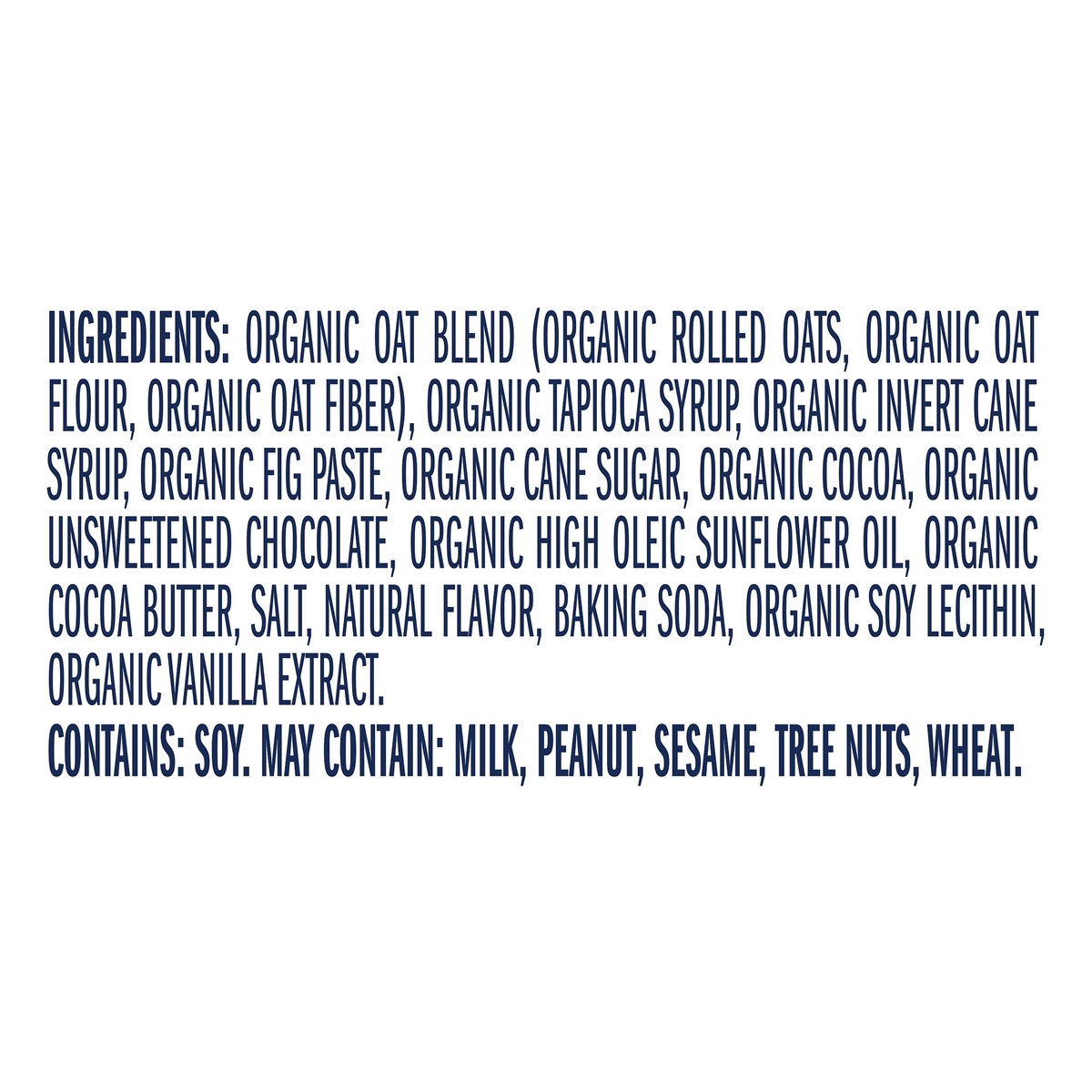 Organic Oat Blend (Organic Rolled Oats, Organic Oat Flour, Organic Oat Fiber), Organic Tapioca Syrup, Organic Invert Cane Syrup, Organic Fig Paste, Organic Cane Sugar, Organic Cocoa, Organic Unsweeten…