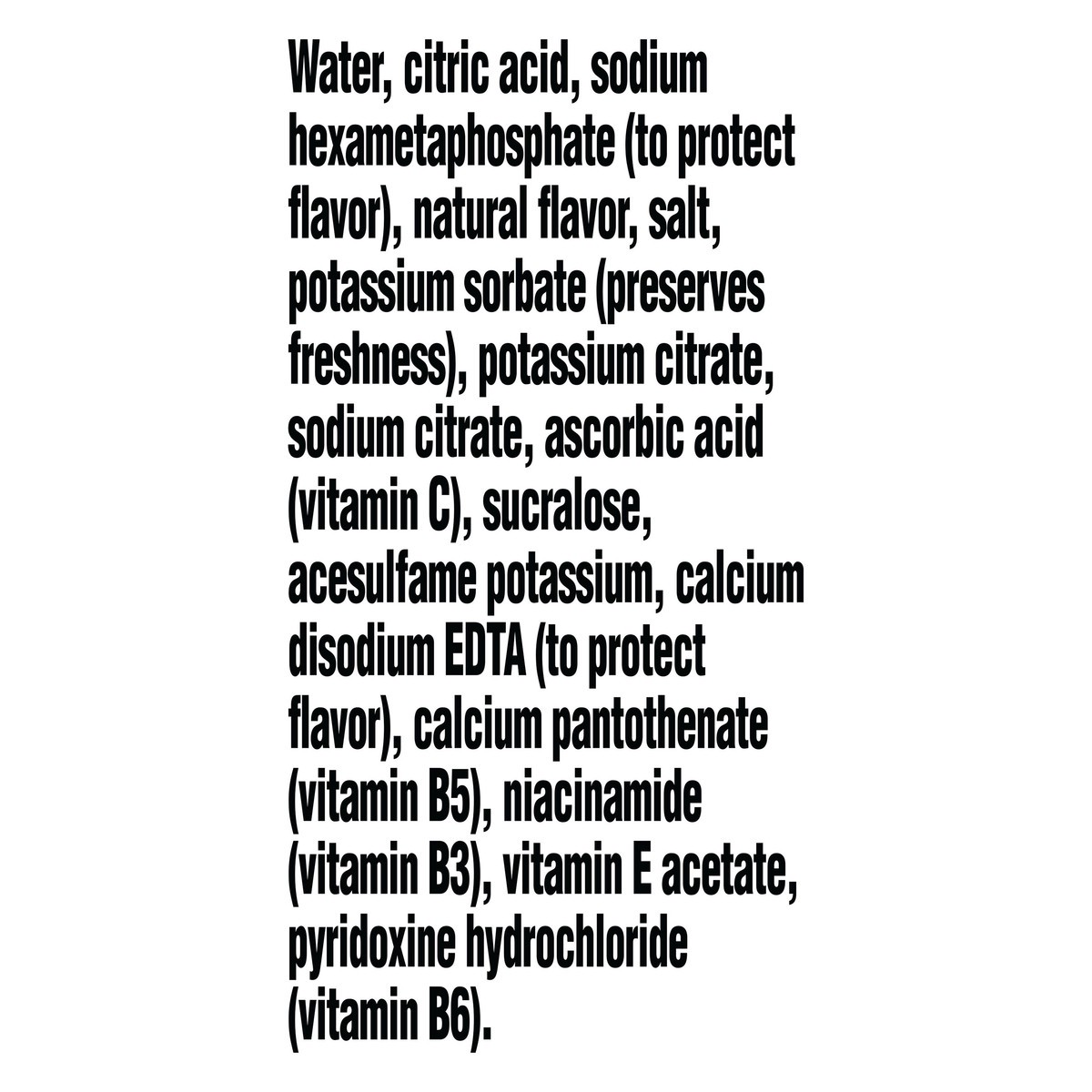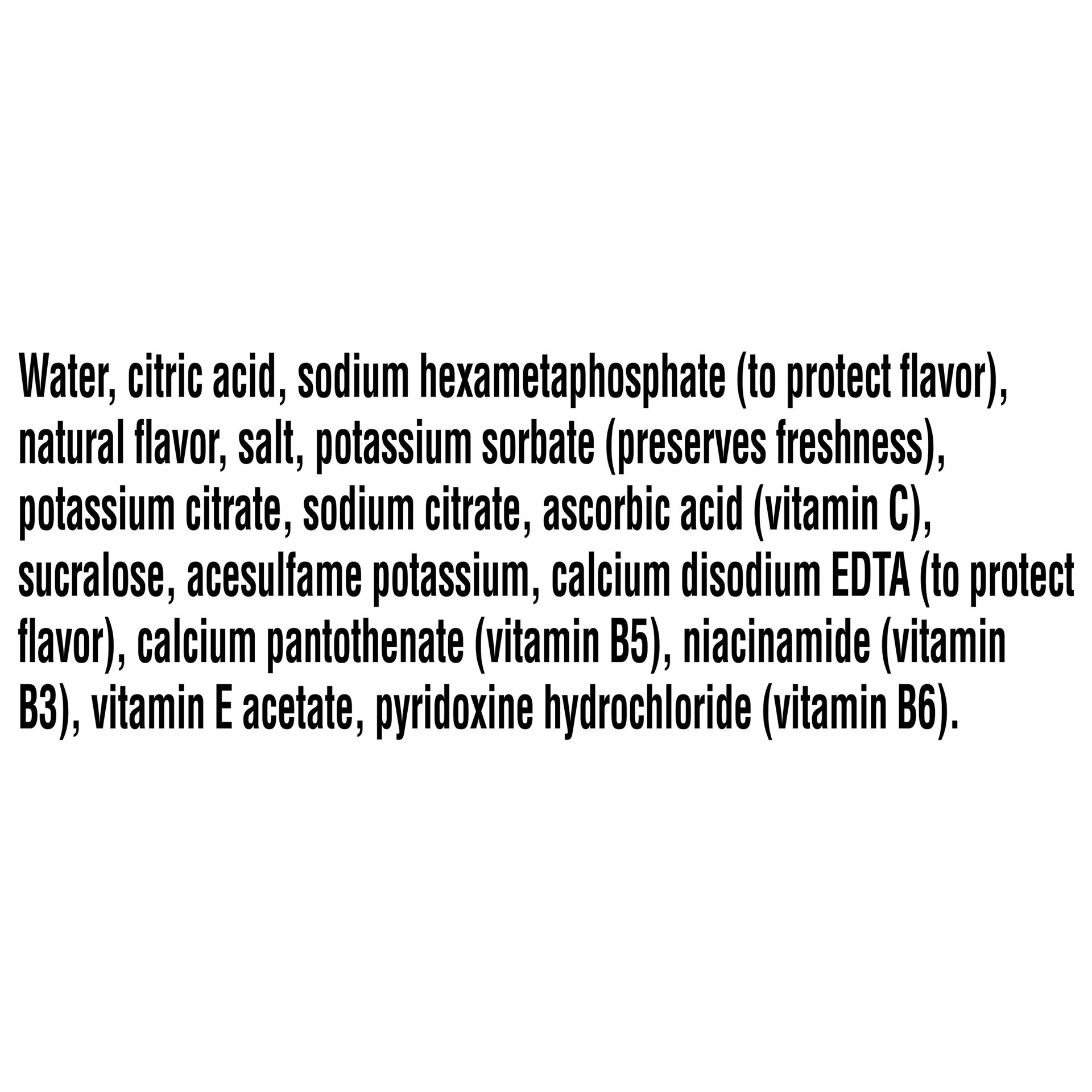 WATER, CITRIC ACID, SODIUM HEXAMETAPHOSPHATE (TO PROTECT FLAVOR), NATURAL FLAVOR, SALT, POTASSIUM SORBATE (PRESERVES FRESHNESS), POTASSIUM CITRATE, SODIUM CITRATE, ASCORBIC ACID (VITAMIN C), SUCRALOSE…