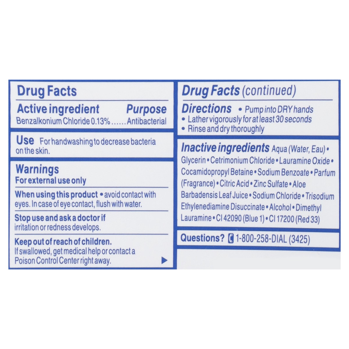 Active Ingredients: Benzalkonium Chloride (0.13 %), Antibacterial. Inactive Ingredients: Aqua (Water, Eau), Glycerin, Cetrimonium Chloride, Lauramine Oxide, Cocamidopropyl Betaine, Sodium Benzoate, Pa…