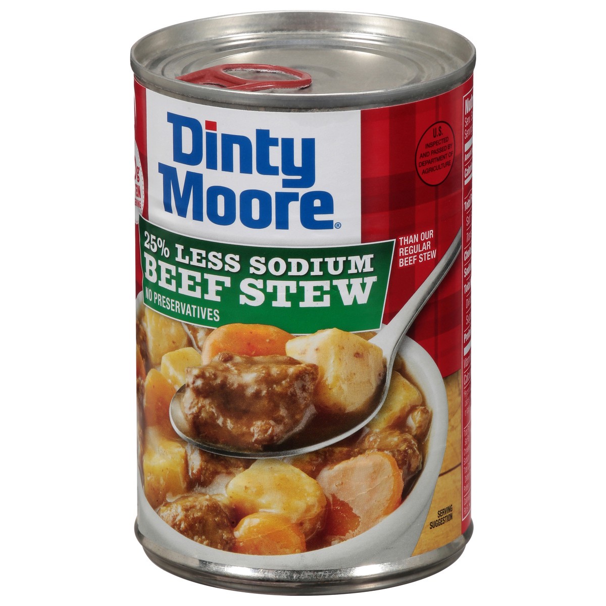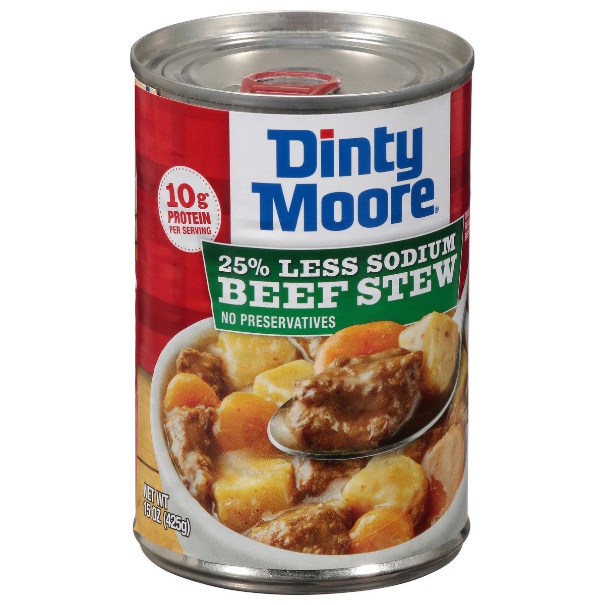 - Includes one 15 ounce can of DINTY MOORE Beef Stew 25%Less Sodium* made with real chunks of beef