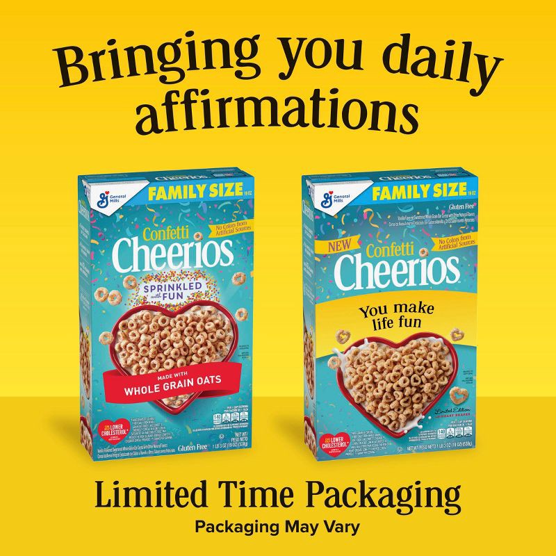 - CONTAINS: One cardboard box of crunchy Confetti Cheerios breakfast cereal, made with whole grain, family size, 19 oz; Perfect for instant snacking, or a part of breakfast or meals