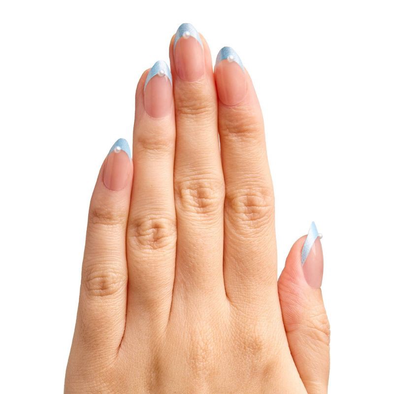 - A shimmering icy blue french mani accented by 3D puffy pearls in a medium almond shape.