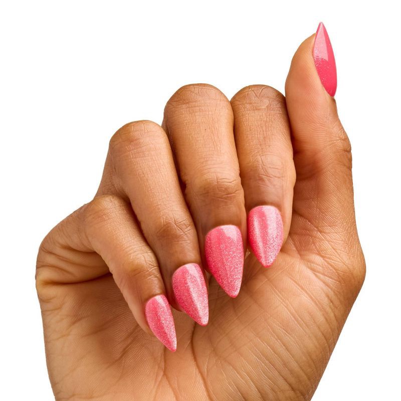 - A hot neon pink mani with a shimmering velvet effect in a medium stiletto shape.