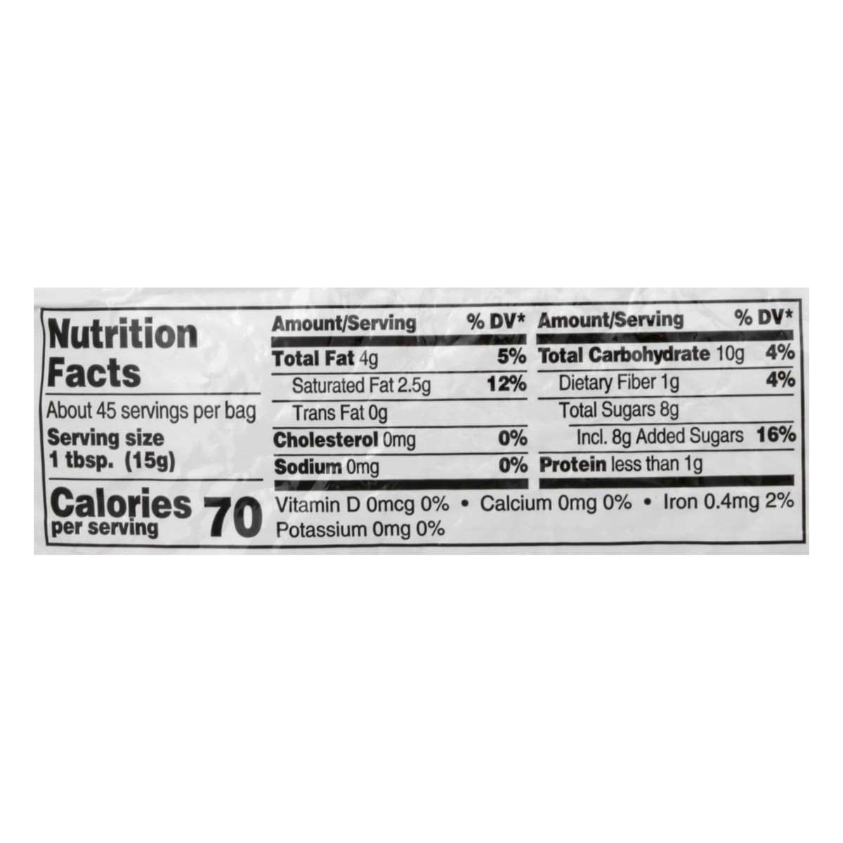 Per 1 Tbsp: 70 calories; 2.5 g sat fat (12% DV); 0 mg sodium (0% DV); 8 g total sugar. Great for baking. Yourplusguarantee. harristeeter.com. Together in Education. Resealable package.