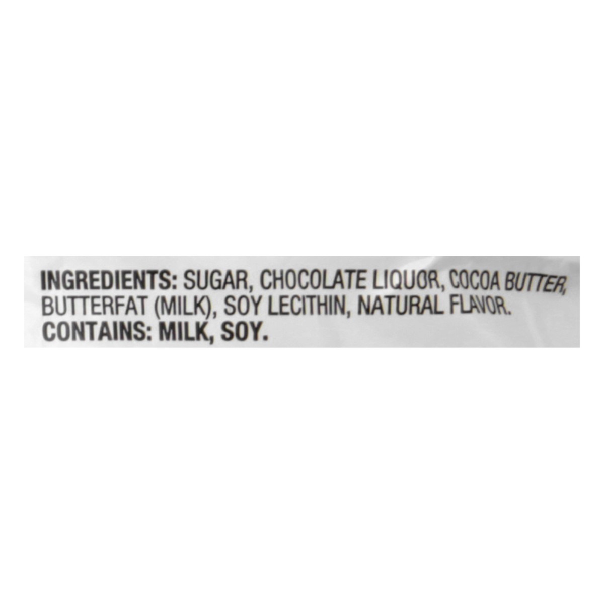 Sugar, Chocolate Liquor, Cocoa Butter, Milkfat, Soy Lecithin, Natural Flavor.