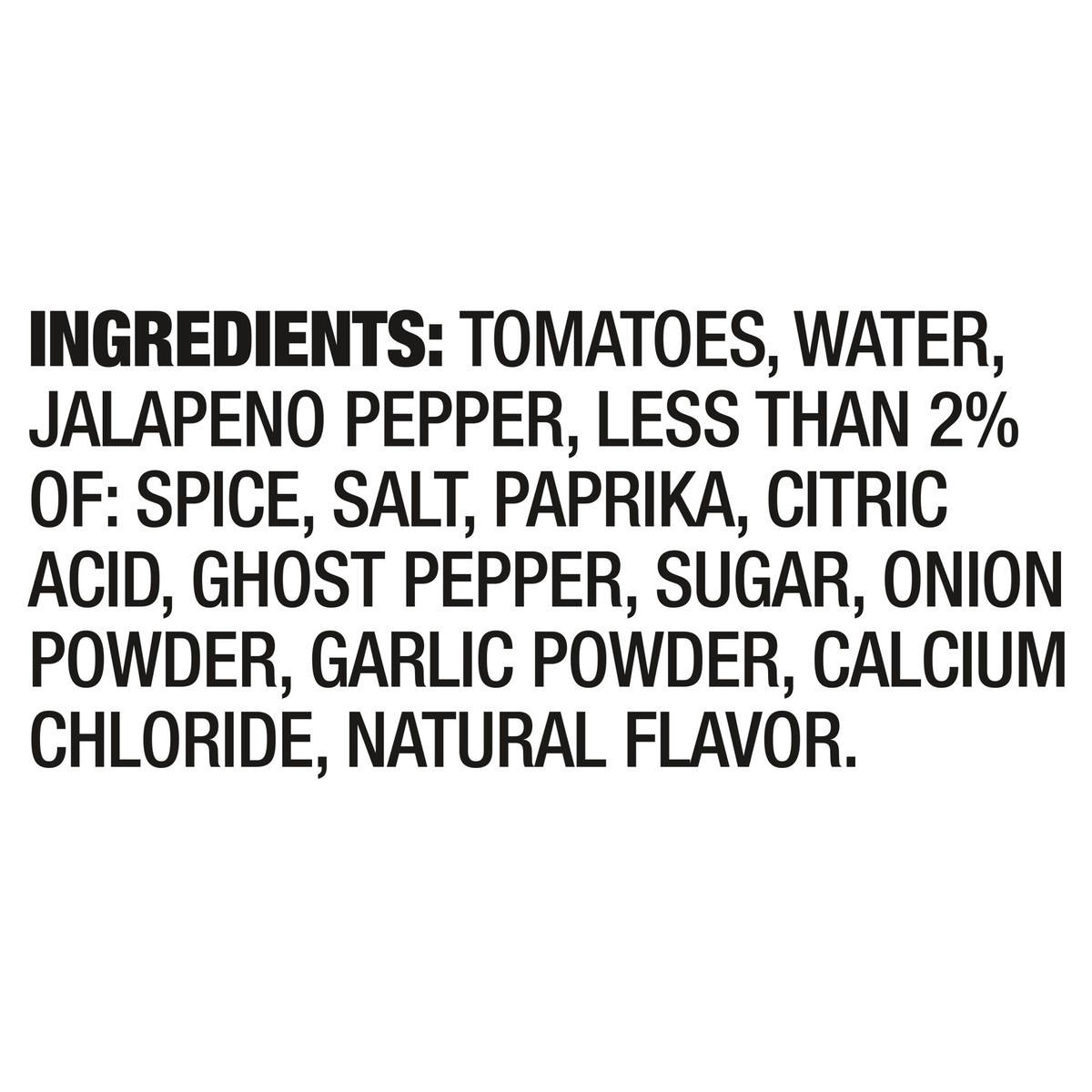 Tomatoes, Water, Jalapeno Pepper, Less than 2% of: Spice, Salt, Paprika, Citric Acid, Ghost Pepper, Sugar, Onion Powder, Garlic Powder, Calcium Chloride, Natural Flavor.