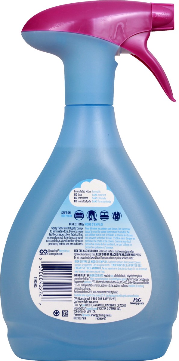 Limited edition. Formulated with: no dyes; no phthalates; no formaldehyde. www.febreze.com. www.pg.com. Questions? 1-800-308-Easy (3279). Bottle made from 25% post-consumer recycled plastic. TerraCycl…