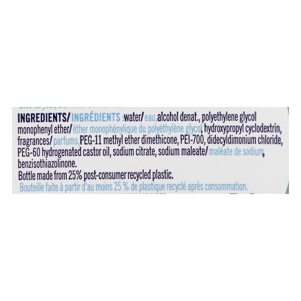 Water/Eau, Alcohol Denat., Polyethylene Glycol Monophenyl Ether, Hydroxypropyl Cyclodextrin, Fragrances/Parfums, PEG-11 Methyl Ether Dimethicone, PEI-700, Didecyldimonium Chloride, PEG-60 Hydrogenated…