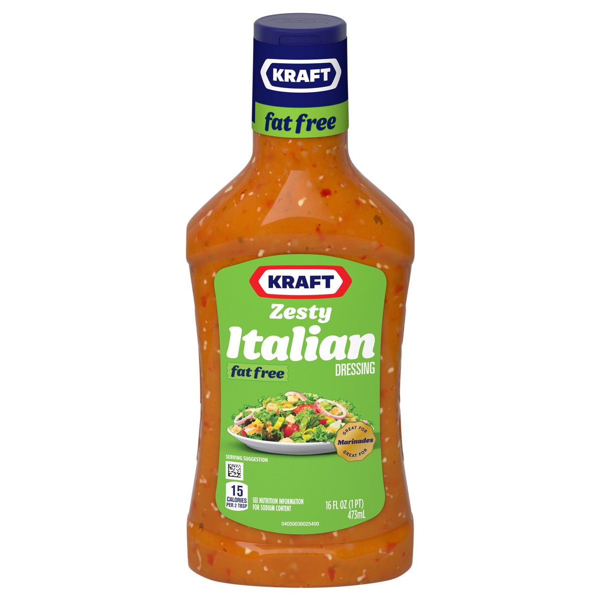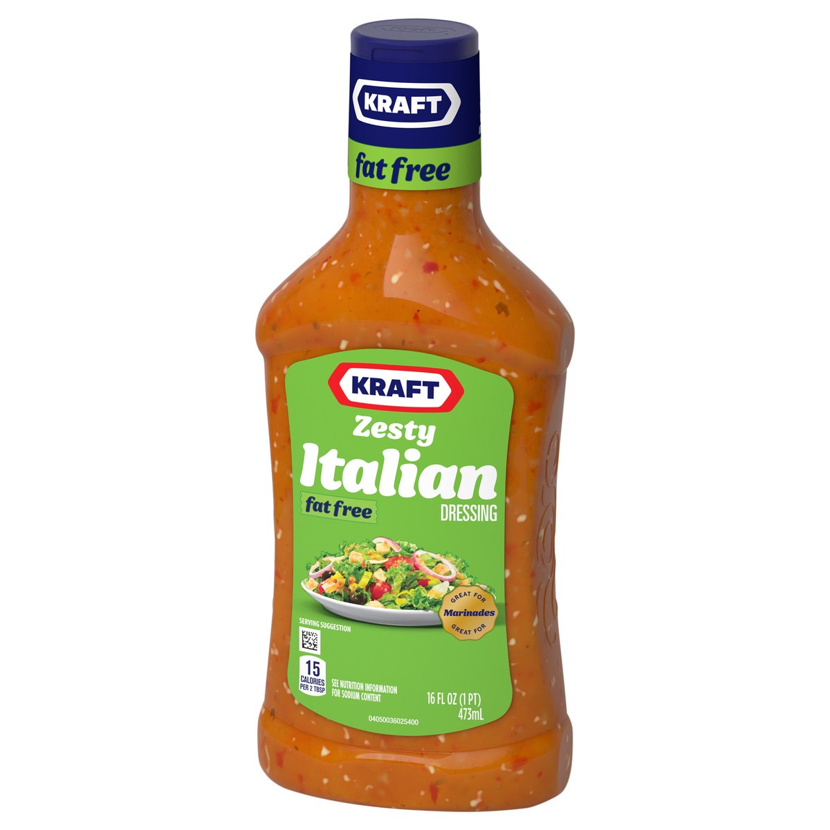 Kraft Zesty Italian Fat Free Dressing adds delicious flavor to virtually any dish. Savor the rich taste of bold spices blended with tangy vinegar and the perfect amount of sugar for a touch of sweetne…