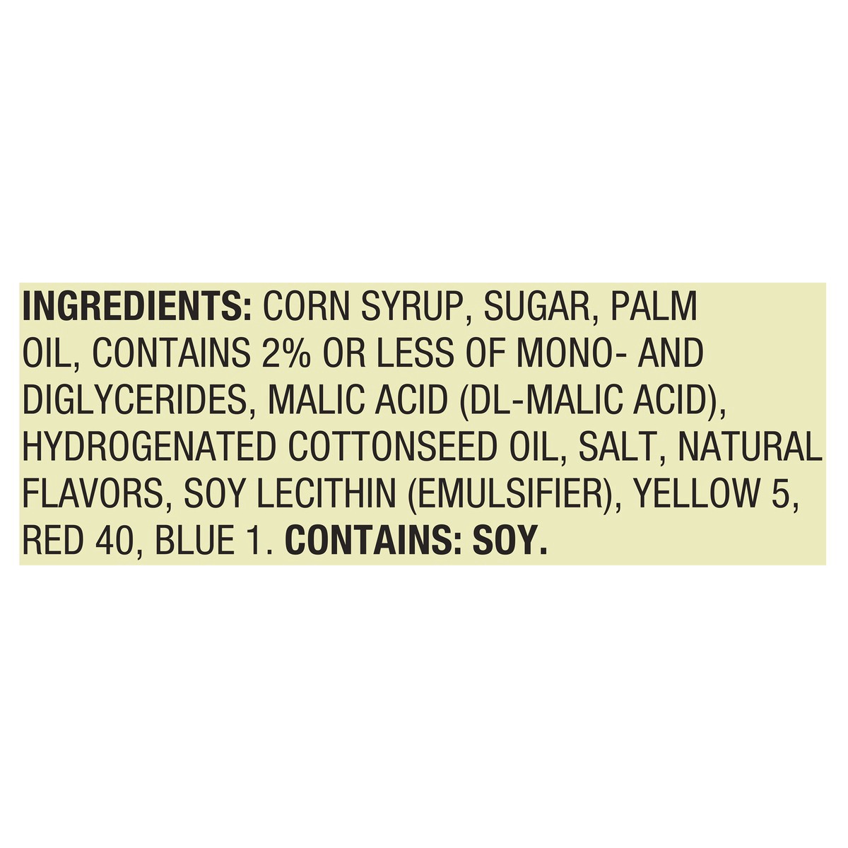 Corn Syrup, Sugar, Palm Oil, Contains 2% or Less of Mono- and Diglycerides, Malic Acid (DL-Malic Acid), Hydrogenated Cottonseed Oil, Salt, Natural Flavors, Soy Lecithin (Emulsifier), Yellow 5, Red 40,…