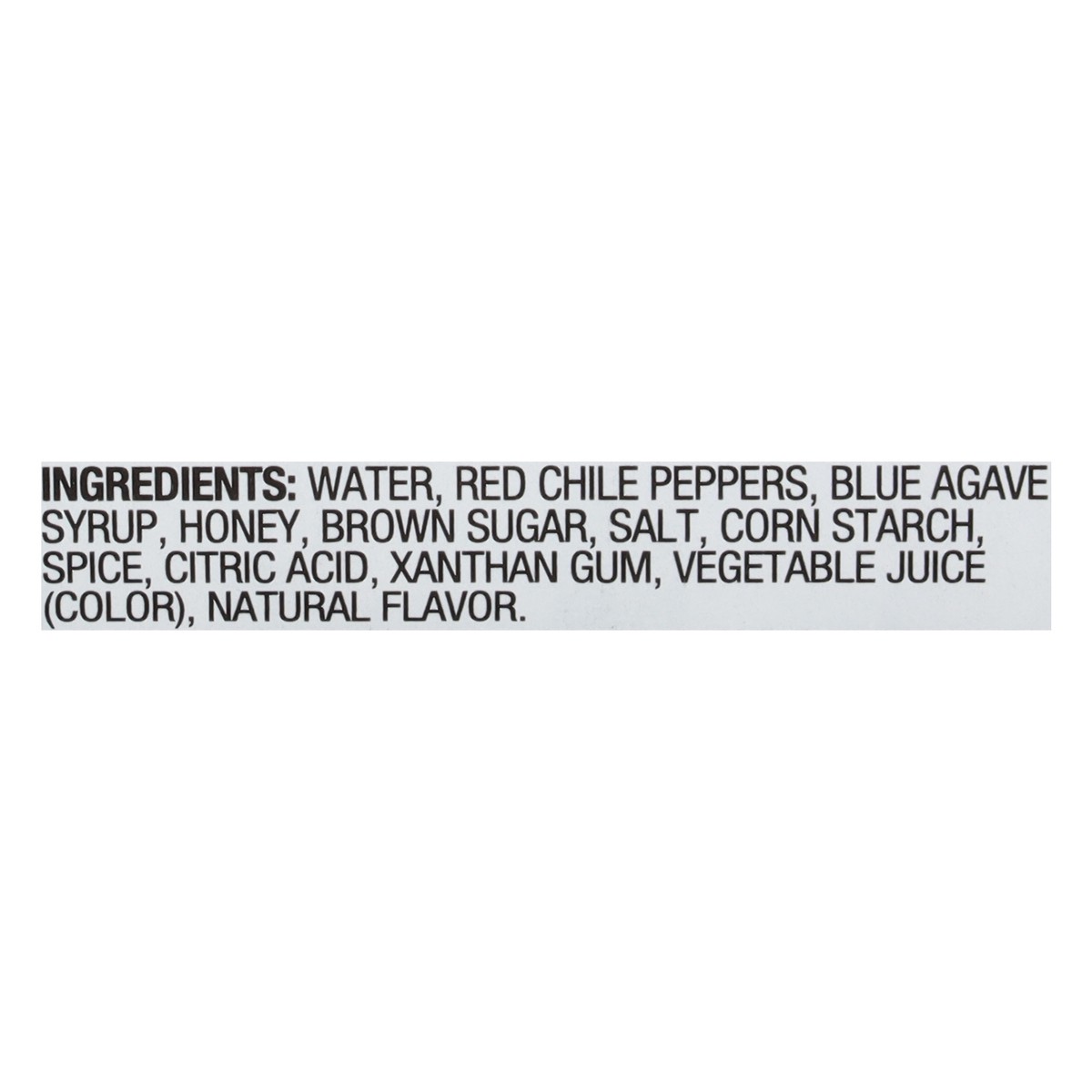 Water, Red Chile Peppers, Blue Agave Syrup, Honey, Brown Sugar, Salt, Corn Starch, Spice, Citric Acid, Xanthan Gum, Vegetable Juice (Color), Natural Flavor.