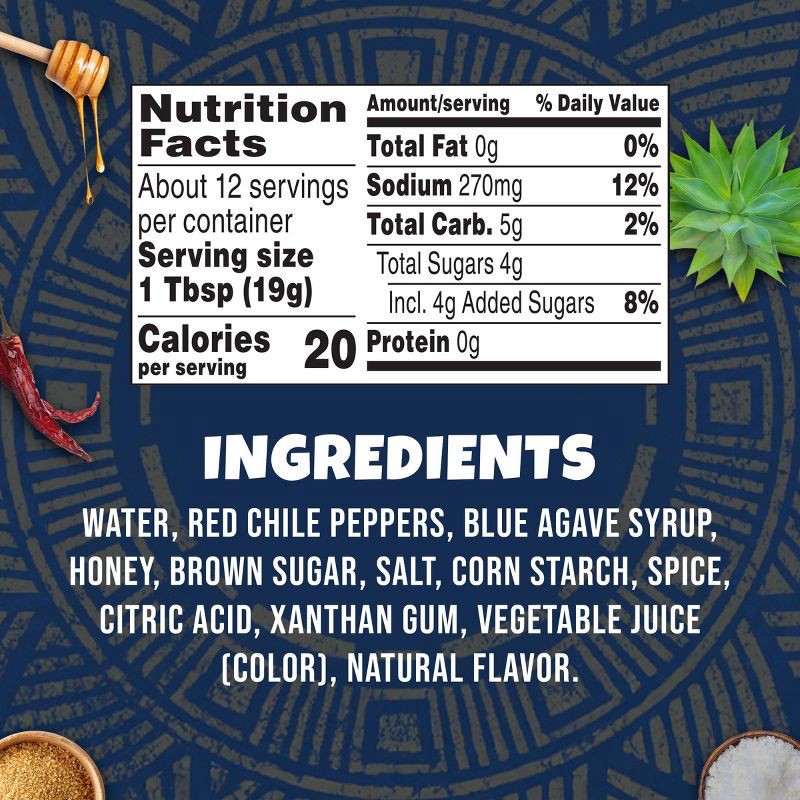 Water, Red Chile Peppers, Blue Agave Syrup, Honey, Brown Sugar, Salt, Corn Starch, Spice, Citric Acid, Xanthan Gum, Vegetable Juice (Color), Natural Flavor.
