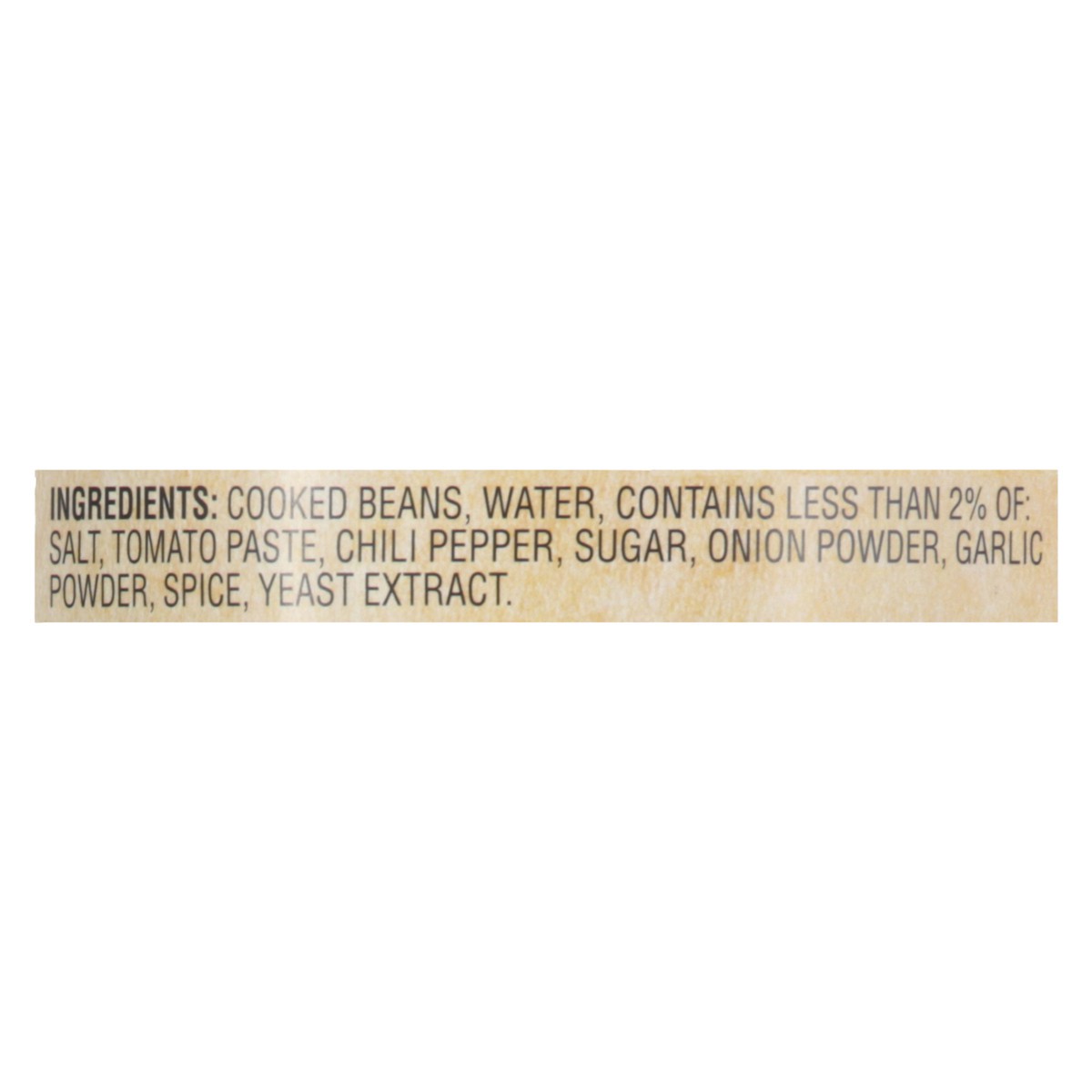 Cooked Beans, Water, Contains less than 2% of Salt, Tomato Paste, Chili Pepper, Sugar, Onion Powder, Garlic Powder, Spice, Yeast Extract.