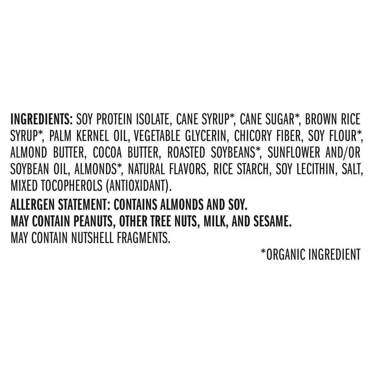 INGREDIENTS: SOY PROTEIN ISOLATE, CANE SYRUP*, CANE SUGAR*, BROWN RICE SYRUP*, PALM KERNEL OIL, VEGETABLE GLYCERIN, CHICORY FIBER, SOY FLOUR*, ALMOND BUTTER, COCOA BUTTER, ROASTED SOYBEANS*, SUNFLOWER…