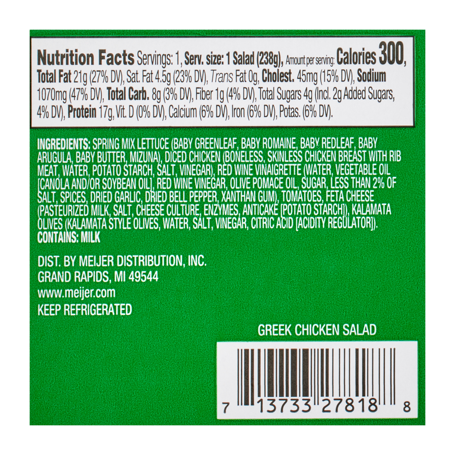 A busy day doesn't have to result in a boring meal. Enjoy a flavorful experience with this Fresh from Meijer Greek Chicken Salad. This ready-to-eat blend of spring mix, chicken, tomatoes, kalamata-sty…