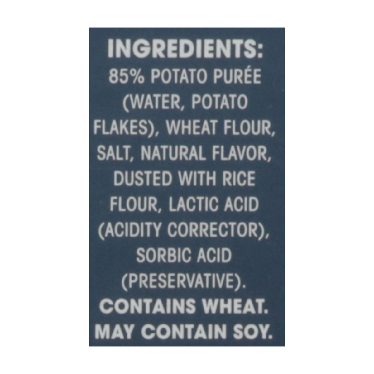 85% Potato Puree (Water, Potato Flakes), Wheat Flour, Salt, Natural Flavor, Dusted with Rice Flour, Lactic Acid (Acidity Corrector), Sorbic Acid (Preservative).