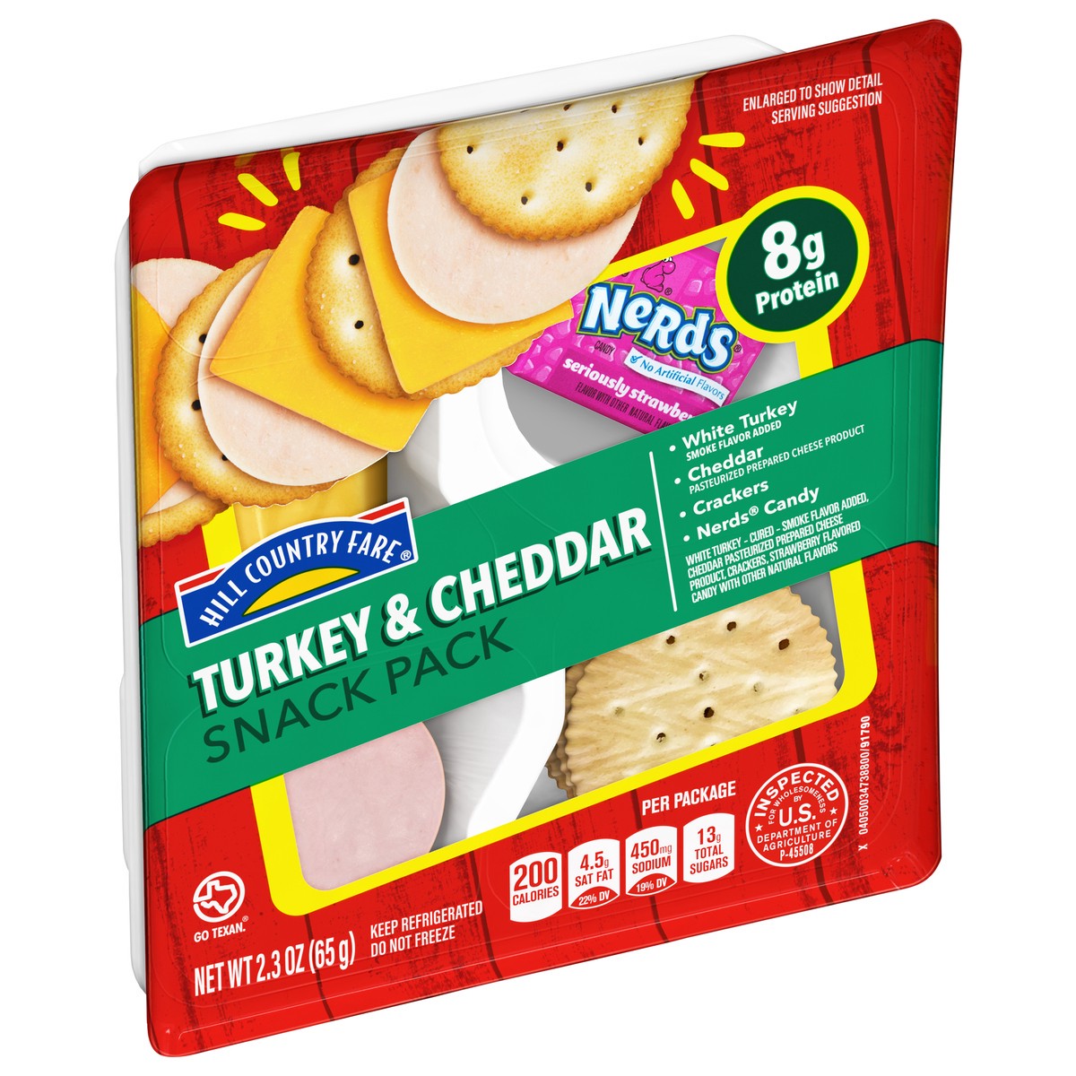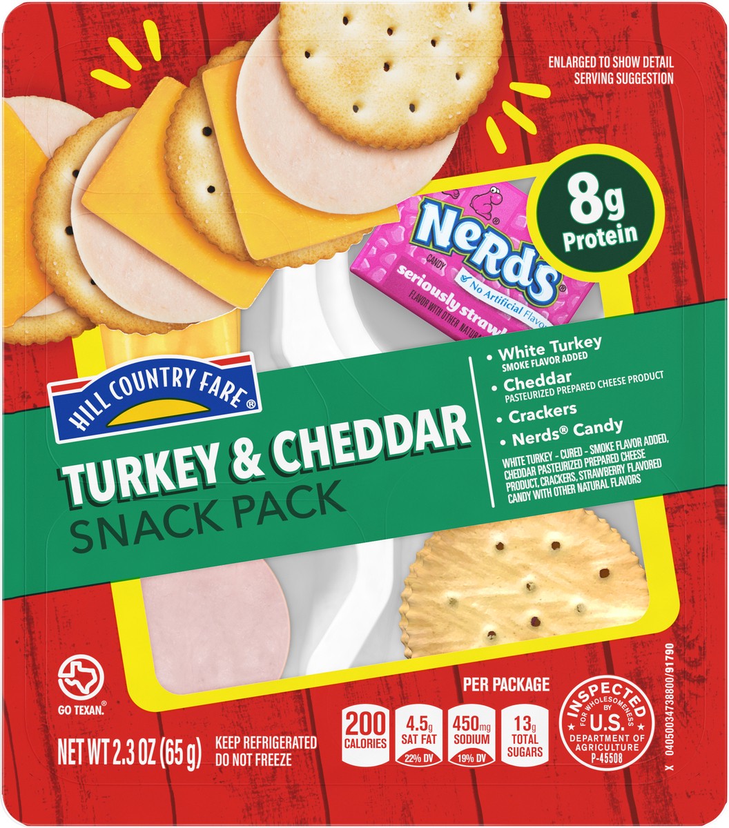Individual snack pack from Hill Country Fare - with savings to feel good about! This snacking tray contains:• White turkey (smoke flavor added)• Cheddar pasteurized prepared cheese product• Crackers• …