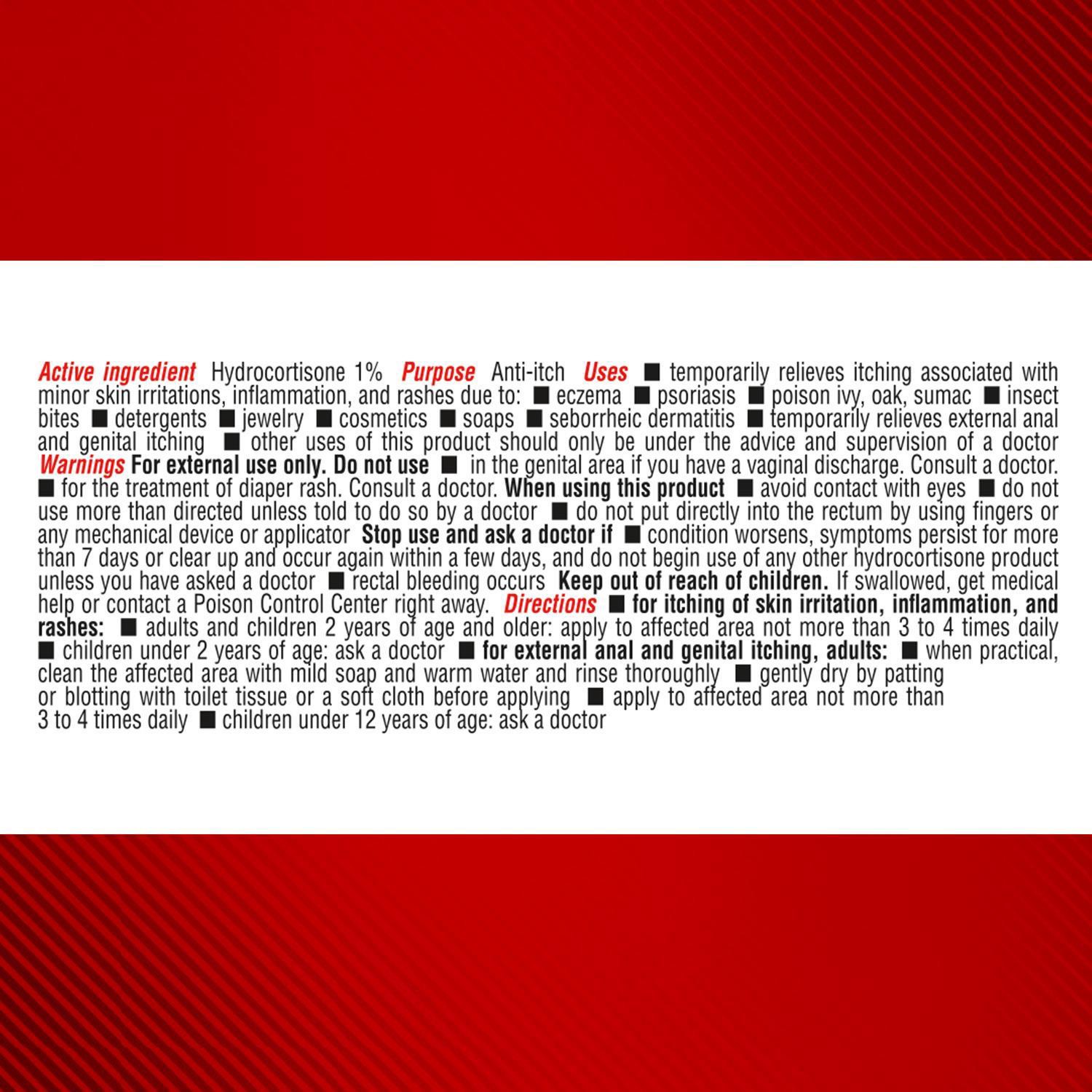 Active Ingredients: Hydrocortisone (1 %), Anti-itch. Inactive Ingredients: Water, Glycerin, Petrolatum, Jojoba Esters, Cetyl Alcohol, Aloe Barbadensis Leaf Juice, Stearyl Alcohol, Distearyldimonium Ch…