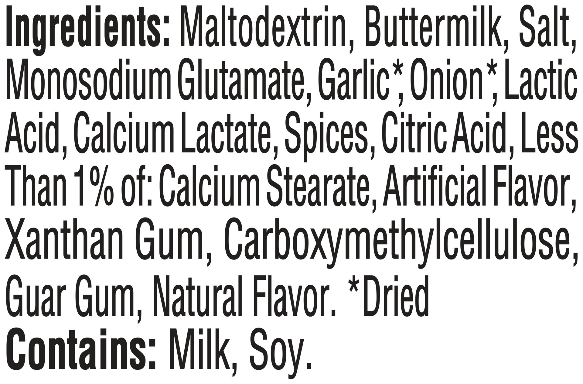Maltodextrin, Buttermilk, Salt, Monosodium Glutamate, Garlic (2), Onion (2), Lactic Acid, Calcium Lactate, Spices, Citric Acid, Less Than 1% of: Calcium Stearate, Artificial Flavor, Xanthan Gum, Carbo…