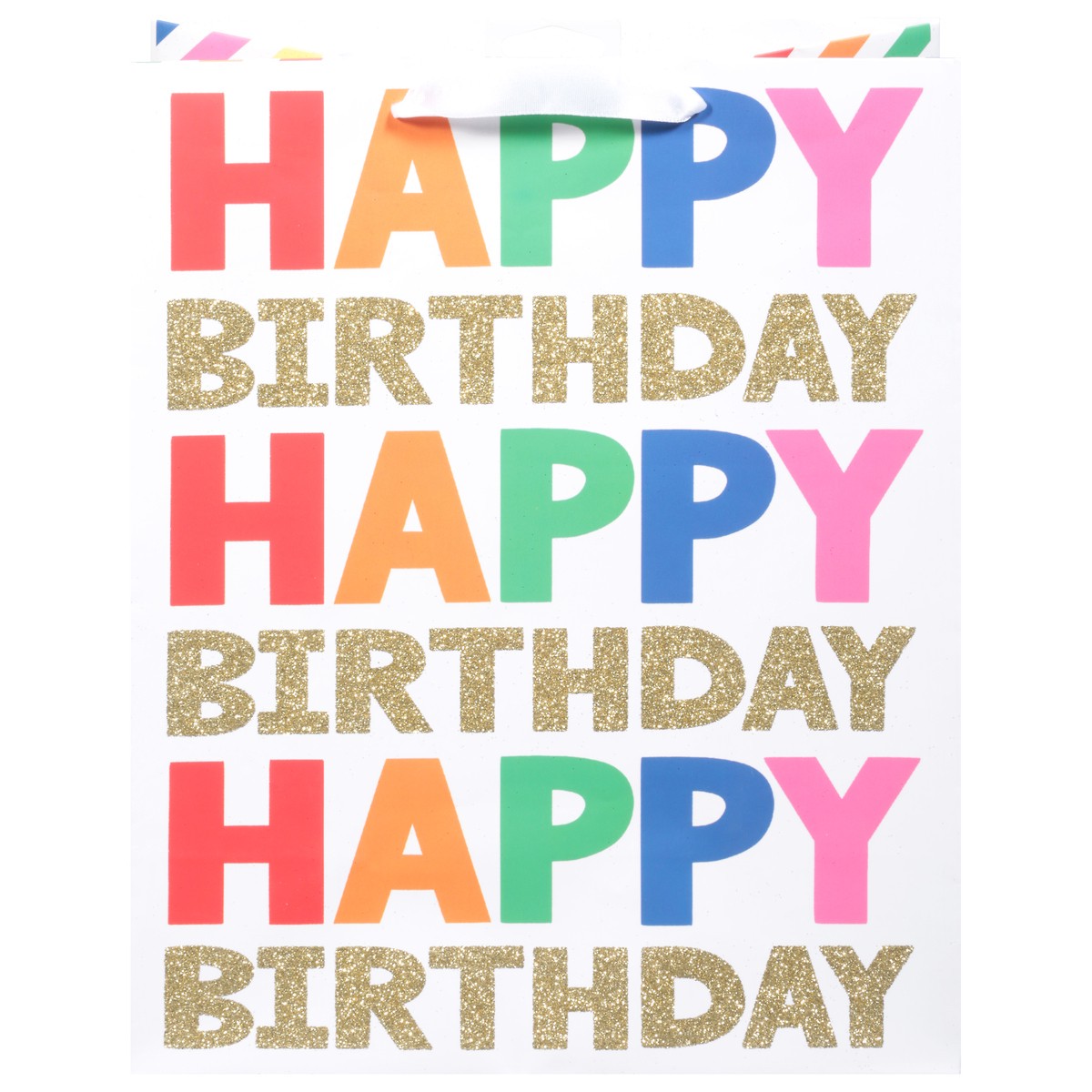 Make a special statement for someone’s birthday with this gift bag. The white bag features repeated “Happy Birthday” in multi-colored and gold lettering while the sides feature multi-colored stripes. …