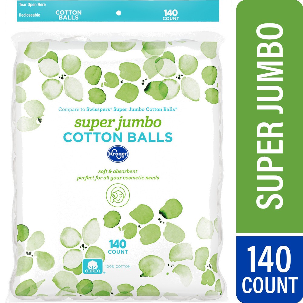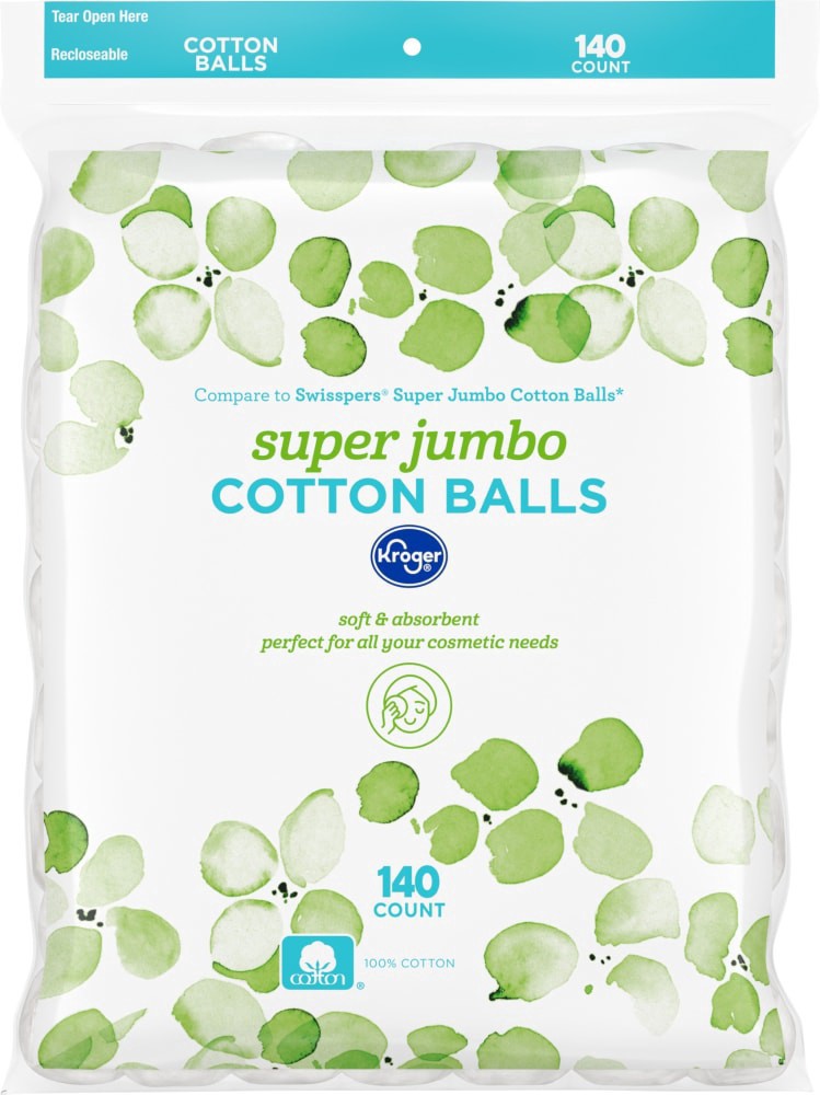 Kroger® Super Jumbo Cotton Balls are your trusty sidekick! Made from 100% cotton, they're pleasingly soft and impressively absorbent to meet all your cosmetic needs. Effortlessly apply cleansers and a…