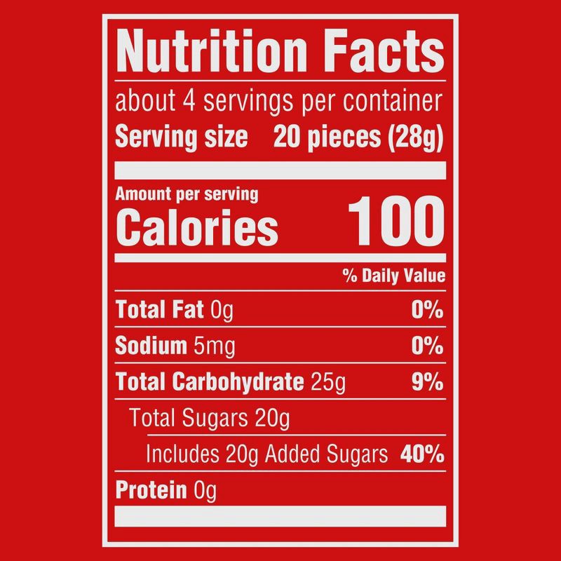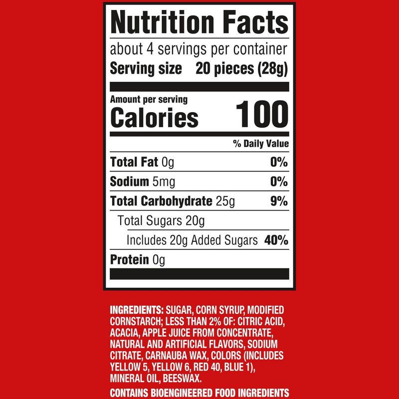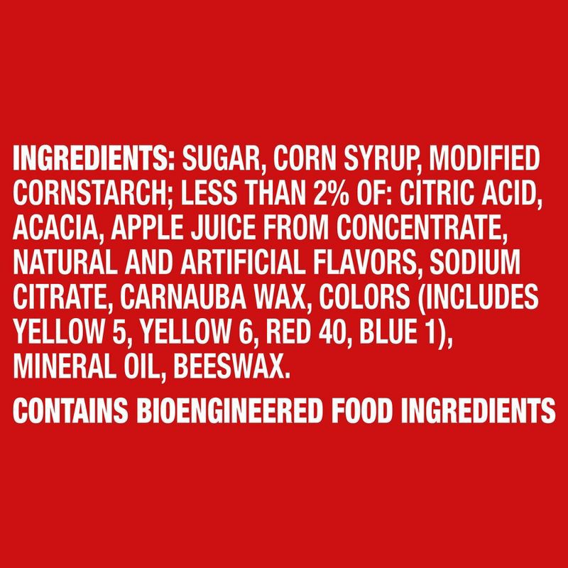 SUGAR, CORN SYRUP, MODIFIED CORNSTARCH; LESS THAN 2% OF: CITRIC ACID, ACACIA, CONFECTIONER'S GLAZE, SODIUM CITRATE, APPLE JUICE FROM CONCENTRATE, NATURAL AND ARTIFICIAL FLAVORS, CARNAUBA WAX, COLORS (…