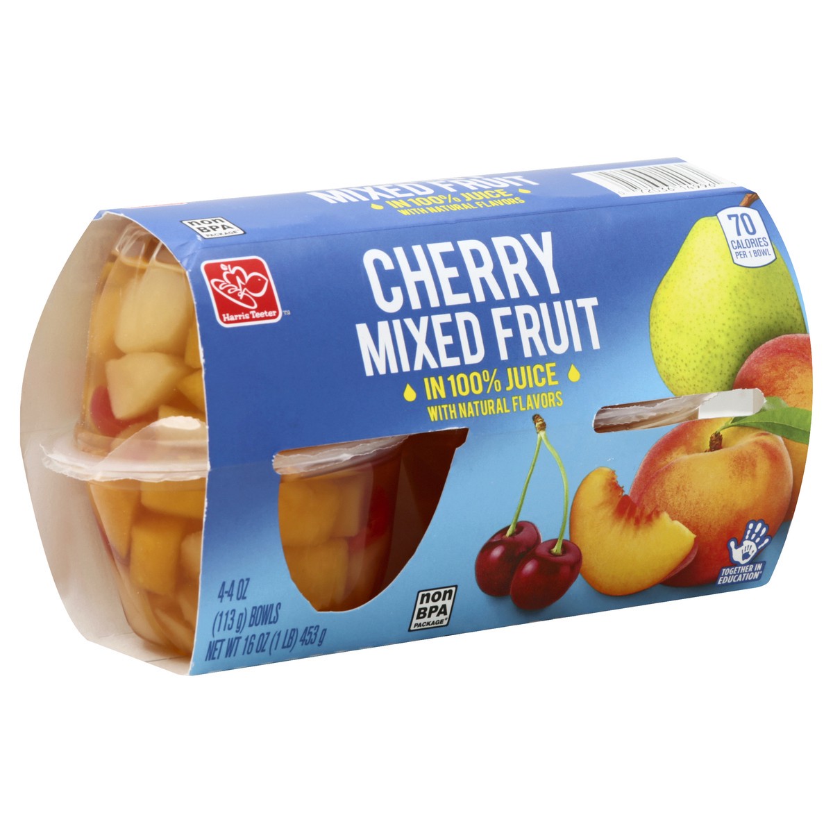 Packed in water. Artificially sweetened. 70 calories per 1 bowl. Non BPA package (This package was produced without BPA). Together in Education. 1-800-432-6111 or harristeeter.com. Product of USA.