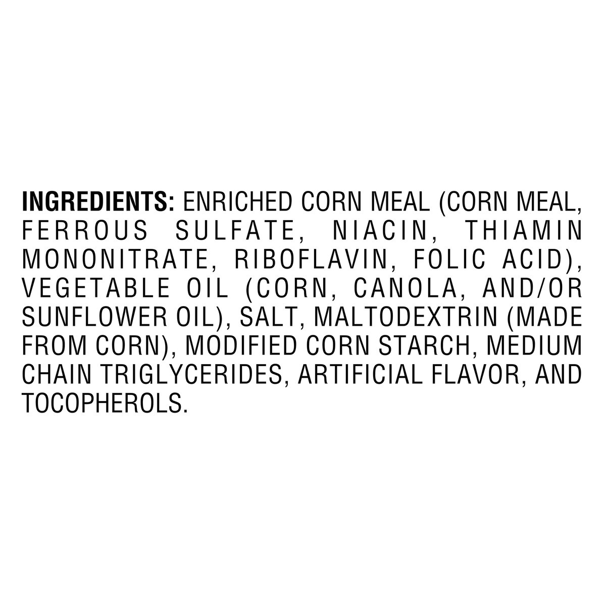 Enriched Corn Meal (Corn Meal, Ferrous Sulfate, Niacin, Thiamin Mononitrate, Riboflavin, Folic Acid), Vegetable Oil (Corn, Canola, and/or Sunflower Oil), Salt, Maltodextrin (Made from Corn), Modified …