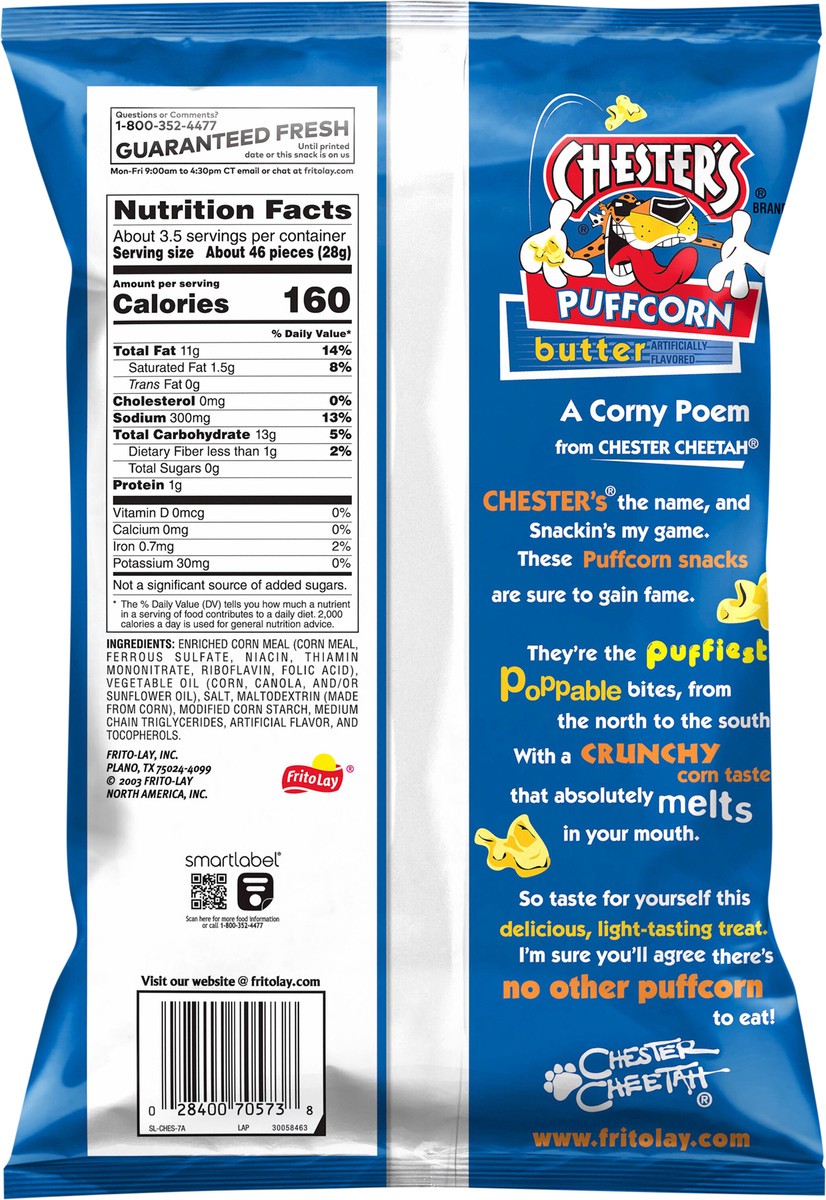 Oven baked unlike popcorn, no hulls or hard kernels. A corny poem from chester cheetah. Chester's the name, and Snackin's my game. These Puffcorn snacks are sure to gain fame. They're the puffiest pop…