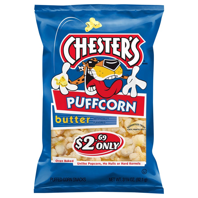 Puffed corn snacks. Artificially flavored. Oven baked unlike popcorn, no hulls or hard kernels. A corny poem from chester cheetah. Chester's the name, and Snackin's my game. These Puffcorn snacks are …