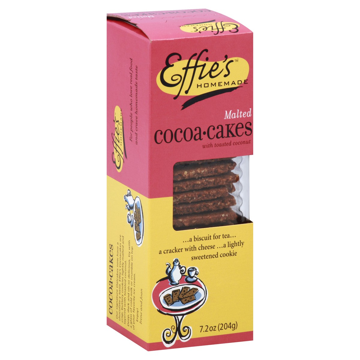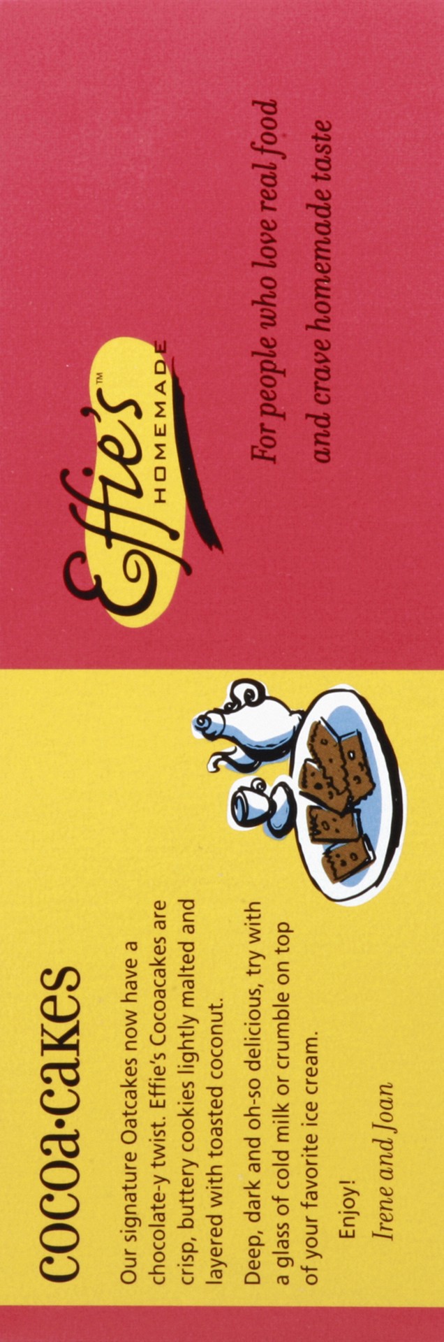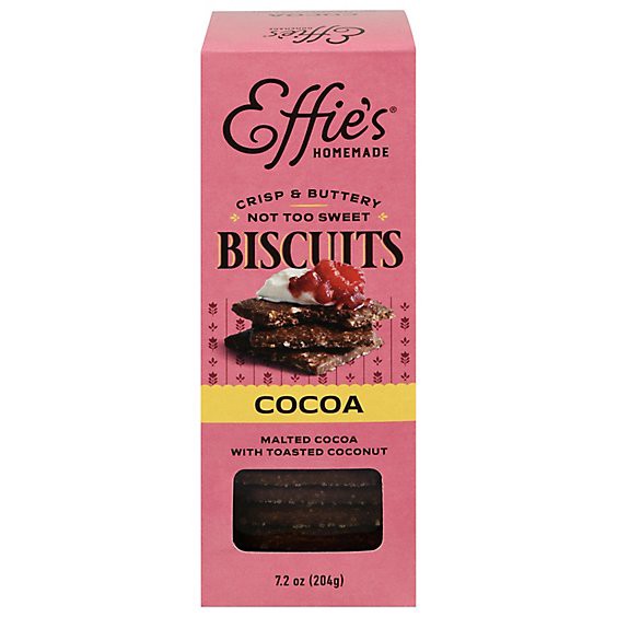 With toasted coconut. A biscuit for tea. A cracker with cheese. A lightly sweetened cookie. Our signature OatCakes now have a chocolate-y twist. Effie's CocoaCakes are crisp, buttery cookies lightly m…