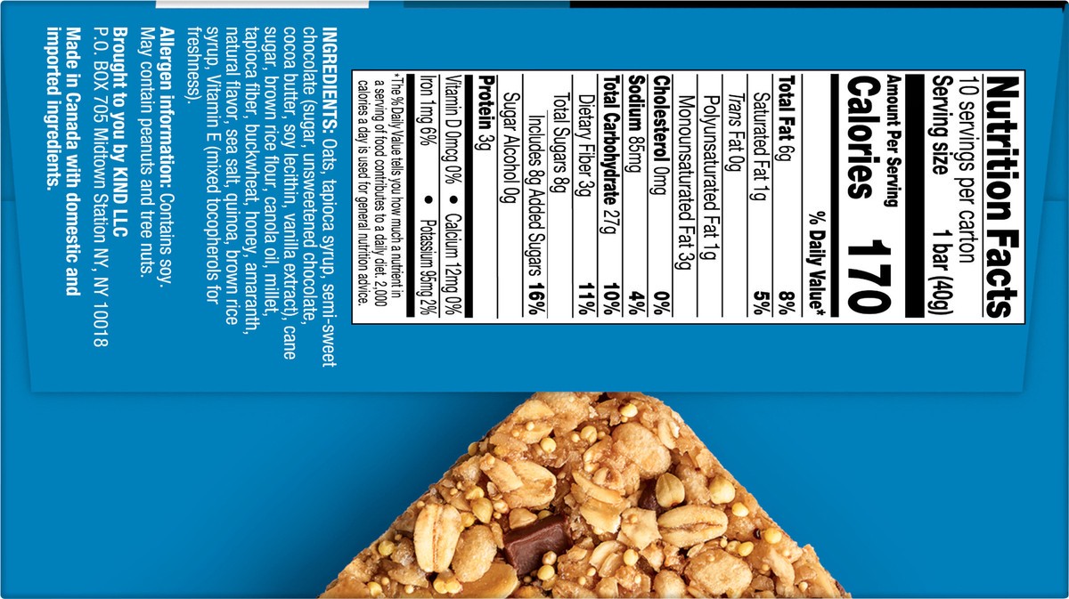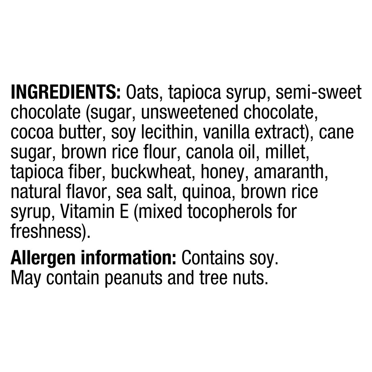 Oats, Tapioca Syrup, Semi-Sweet Chocolate (Sugar, Unsweetened Chocolate, Cocoa Butter, Soy Lecithin, Vanilla Extract), Cane Sugar, Brown Rice Flour, Canola Oil, Millet, Tapioca Fiber, Buckwheat, Honey…