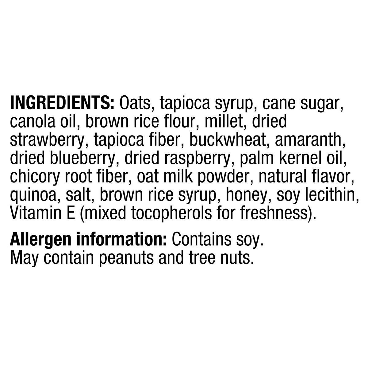 Oats, Tapioca Syrup, Cane Sugar, Canola Oil, Brown Rice Flour, Millet, Dried Strawberry, Tapioca Fiber, Buckwheat, Amaranth, Dried Blueberry, Dried Raspberry, Palm Kernel Oil, Chicory Root Fiber, Oat …